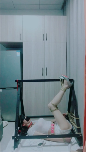 家里闲置了两根长棍子,本来想X型缚的,结果捆好腿之后腿部都失去了活动的能力,所以导致双手很不灵活,加上很久没有玩三角架了,忍耐力下降,捆绑好之后只能脚尖顶地,所以只能简单的束缚一下双手,加紧练习一下下次试试能不能捆好,两种姿势都是比较难受的,捆绑过程也挺消耗体力,加上电击片都在无时不刻的折磨着自己,拍好之后没有多余的体力拍摄其他方式的束缚了。