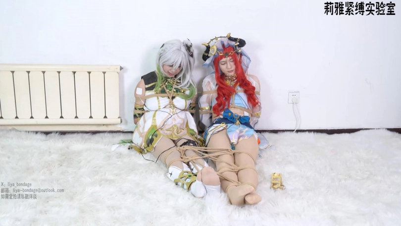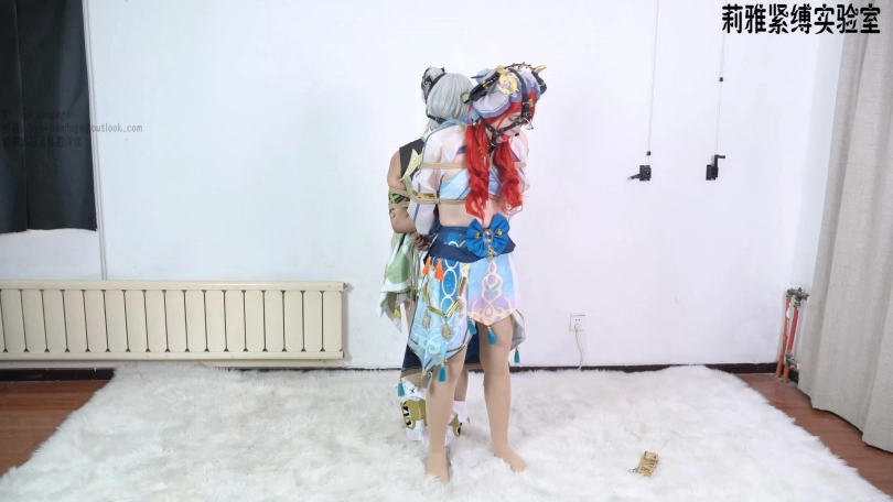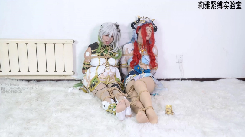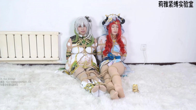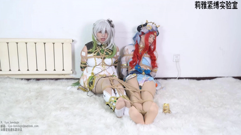 part1:妮露和草神连缚在一起,带着马具口球互相拉扯着扭动着呻吟着,在试图帮忙解绑对方失败后,站不稳也瘫倒在地