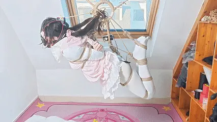 双腿双脚连同脚背都被绳子八字牢牢并排捆住,头部仰起日式驷马掉在空中,身体与一个环完美形成一个整体。