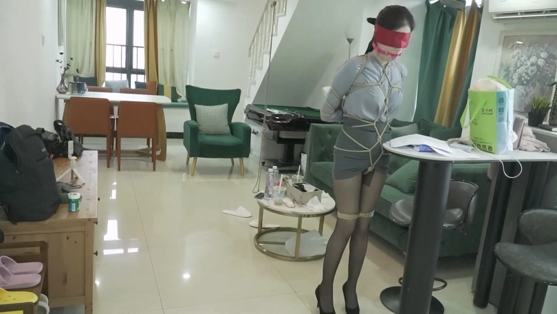 挑战4.五花后高手捆绑,蒙住眼睛,捆住大腿,思思要在10分钟内根据提示词在房间内找到钥匙,否则任务失败。