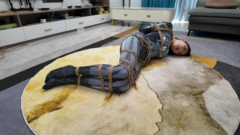 女蜘蛛潜入房间搜查,被抓获捆绑,股绳套在双脚上,一动就会扯动股绳,上半身吊起,这个姿势还是很难受的,并且会紧紧勒着下面,刺激着下面,接下来后手观音驷马更是加大难度,这个女蜘蛛被束缚的可惨了.
