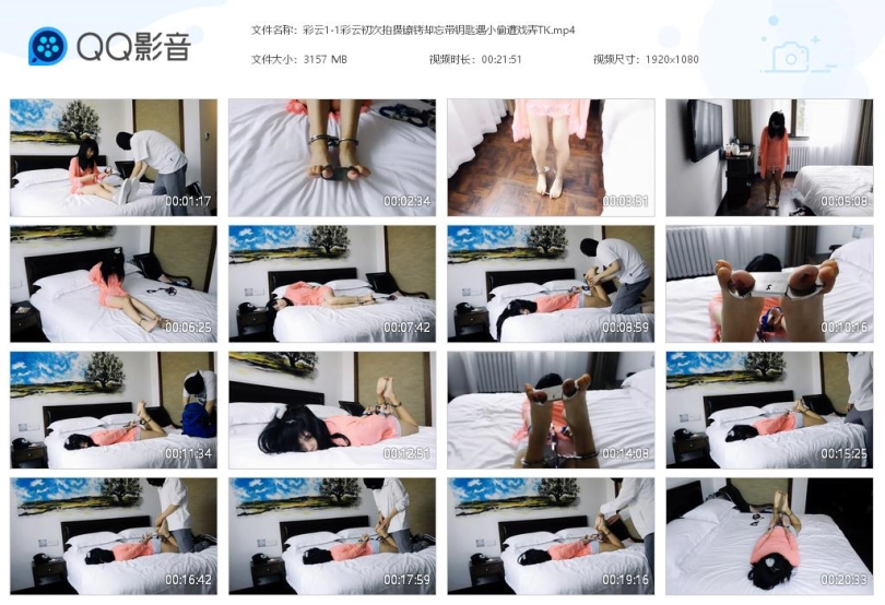 【视频时长】:00:21:51 【文件大小】:3157M 关键词:彩云 初次拍摄镣铐 却忘带钥匙 遇小偷遭戏弄 TK 手铐 脚铐脚 趾铐 裙子 帆布鞋 棉袜 袜子堵嘴 妹子和摄影师一起进门,妹子第一次来体验拍镣铐,对一切充满了好奇,而摄影师也是第一次拍这个女孩,在拍之前先试试道具。摄影师首先脱下妹子的鞋袜,铐上脚铐和脚趾铐,问问妹子感觉如何,妹子觉得挺舒服的。妹子先在床上活动下,然后,下地走走感受下。摄影师给妹子戴上背铐,问问妹子感觉如何,妹子觉得也还挺好。妹子先在床上活动下,然后,下地走走感受下。摄影师给让妹子趴下,驷马铐上感受下。问问妹子感觉如何,妹子觉得还挺舒服的。妹子觉得这个姿势真挺舒服的,挤压着胸还挺刺激的,充满了好奇。摄影师想给妹子解开时,发现忘了带钥匙,怎么找也找不到,告诉了妹子。妹子吓坏了,摄影师说马上回家去取,在这里安心趴着别害怕。妹子一个人在房间里趴着,特别害怕,第一次就遇到这种事,甚至怀疑摄影师是个骗子,哭了出来。这时,一个小偷撬门进入,看到了床上的妹子,询问妹子咋回事,妹子解释不清一直在哭泣。小偷看妹子动不了,觉得可以玩了,挠脚心一下。最后,用袜子堵上妹子的嘴,拿上赃物离开。妹子觉得受到了委屈,哭了。 妹子第一次尝试啦!!!处女作!!! ![]() ![]() ![]() ![]() ![]() ![]() ![]() ![]() ![]() ![]() ![]() ![]() ![]() ![]() ![]() ![]()