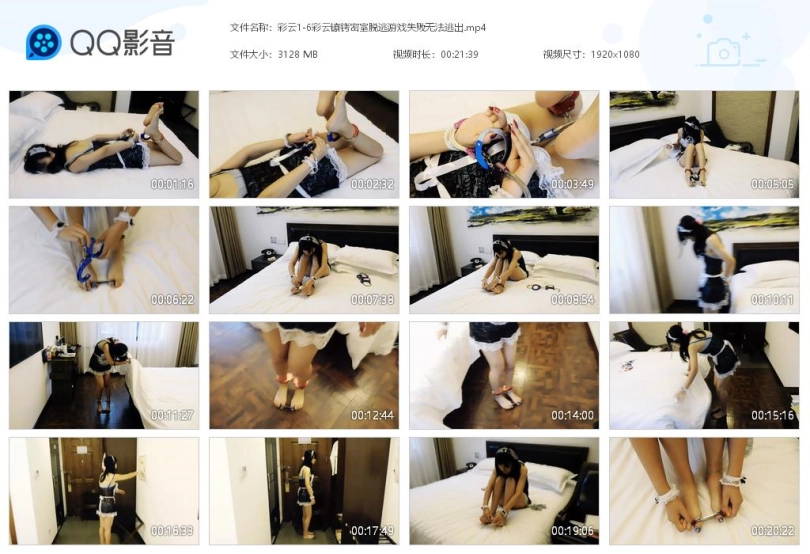 【视频时长】:00:21:38 【文件大小】:3128M 关键词:彩云镣铐密室脱逃游戏 失败 无法逃出 手铐 脚铐 脚趾铐 女佣装 妹子醒来发现,自己被驷马锁住了,很着急。这时有一个神秘广播发话了,说妹子进入了一个密室脱逃游戏,每找到一把钥匙就可以解开一个镣铐,在规定时间内全部解开才可以出去,否则的话就再也出不去了。妹子很害怕,但也决定要赶紧想办法找钥匙。突然间第一把钥匙就出现在了妹子手心,妹子解开了连接手脚的手铐。妹子坐了起来,床上找找钥匙,找到了手铐钥匙,解开。妹子继续慢慢行走,找到脚铐钥匙,解开。妹子继续寻找最后一把钥匙。当妹子看到最后一把解开脚趾铐的钥匙时,钥匙就突然消失了。神秘声音发话了,说时间到了,游戏失败,再也出不去了。妹子这下很着急了,尝试拔出来脚趾铐却不行,砸门也开不开,尝试穿袜子也穿不上,着急哭了。 妹子第一次尝试啦!!!处女作!!! ![]() ![]() ![]() ![]() ![]() ![]() ![]() ![]() ![]() ![]() ![]() ![]() ![]() ![]() ![]() ![]()
