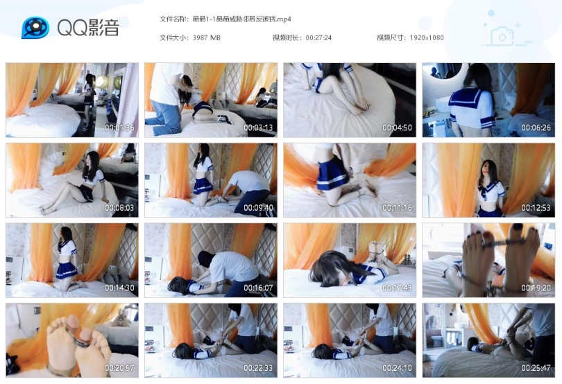 【视频时长】:00:27:23 【文件大小】:3987M 关键词:晶晶 威胁邻居 被铐 手铐 脚铐 脚趾铐 水手服 帆布鞋 口球 跪姿镣铐 驷马镣铐 TK挠脚心 晶晶擅闯邻居私宅,发现了邻居大哥的小秘密,企图威胁邻居却被反杀,脚趾铐被锁在了自己的脚上这叫一个难受哈哈哈!!!邻居大哥拿出所有玩具,可把晶晶折磨坏了哈哈哈!!! 妹子去找邻居家有点事,看到没锁门就偷偷先进去了。在床上发现一个脚趾铐,十分好奇,并且想把这件事透漏出去。这时邻居回来了,妹子想借此敲诈一笔,扬言不给钱就告诉大家邻居玩这种东西。邻居生气了,要让妹子尝尝脚趾铐的滋味,脱下鞋袜,锁上脚趾铐,然后离开。妹子被带上脚趾铐很难受,各种想拔下来,却没办法,下地走路企图活动下,却更疼。邻居回来了,把妹子放到,手背后锁住,戴上脚铐,再加上一个脚趾铐,手脚连起来,跪在床上,戴上口球。妹子挣扎却说不出话,恐惧。 邻居又回来,解开连接,让妹子趴下,驷马镣铐。妹子仍旧说不出话,更恐惧。邻居再次出现,解开口球,放下妹子,要求妹子不许泄露出去,妹子开始不服,于是开始挠脚心。后来换个角度,直到妹子答应为止。 ![]() ![]() ![]() ![]() ![]() ![]() ![]() ![]() ![]() ![]() ![]()