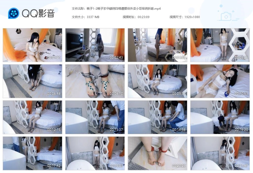 【视频时长】:00:23:08 【文件大小】:3337M 关键词:桃子 家中 镣铐 自缚 遭猥琐外卖小哥 吊铐折磨 手铐 脚铐 脚趾铐 蕾丝内衣 凉鞋 我们可爱的桃子小姐姐,竟然在家中自己玩镣铐自缚,等着外卖小哥来解救自己,结果被外卖小哥更严厉的惩罚,遭遇超级咸猪手,脚趾点地还被锁上趾铐超级疼的!!!真是太可爱了哈哈哈!!! 妹子一个人回家,想玩点刺激的,塞入[不可描述],遥控器和钥匙藏在远处,戴上脚铐、脚趾铐。妹子下地走,把遥控器和钥匙藏在远处,感觉十分刺激。妹子想玩点更刺激的,锁上三通,把一只脚锁在柱子上,彻底动不了了。同时订了份外卖,等着外卖小哥来解救自己。妹子玩了一会,拔脚镣却弄不掉。妹子觉得既然走不了,不如多锁一点吧,于是背后锁上手铐。妹子十分兴奋,期待着遇到的外卖小哥是什么样的人,感觉到了[不可描述]。外卖小哥来送,见到妹子十分吃惊,询问情况。妹子拜托小哥给自己解开,告诉他钥匙和遥控器在哪。小哥拿到钥匙和遥控器后,面露猥琐,要挟妹子和他一起玩,要么就把这些传出去,并伸进内衣里一通乱摸。妹子十分惊慌,连声制止却动弹不得。小哥解开妹子,抱到架子前,双手举高吊起妹子,踮起脚尖,然后离去。留下妹子挣扎,十分难受,双脚只有脚尖点地,还被锁住了脚趾,十分疼痛,哭了。 桃子大美人不多说,表现力也是极佳,可以说是我拍过最漂亮的模特!!! ![]() ![]() ![]() ![]() ![]() ![]() ![]() ![]() ![]() ![]() ![]() ![]() ![]() ![]() ![]() ![]()