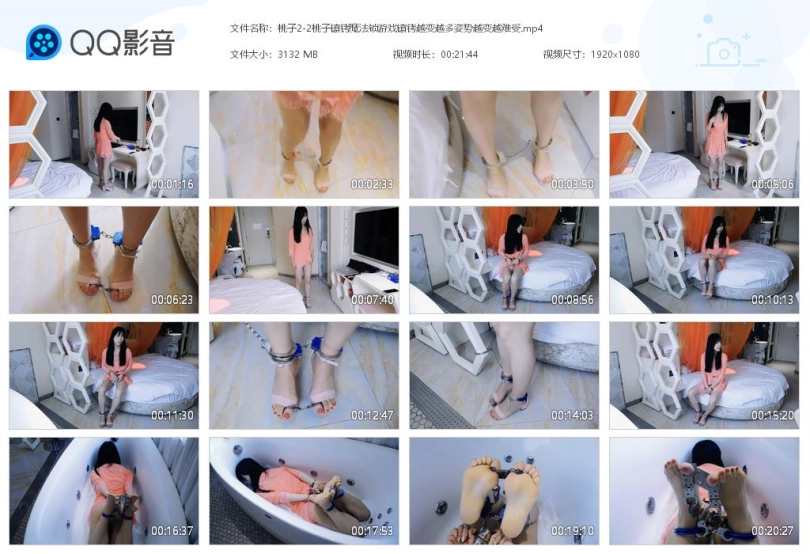 【视频时长】:00:21:44 【文件大小】:402MB 关键词:桃子 镣铐 魔法锁游戏 镣铐越变越多 姿势越变越难受 手铐 脚铐 脚趾铐 裙子 高跟鞋 蛋蛋 妹子下班刚回家,准备休息。忽然发现桌子上有个纸条,写着什么神奇的魔法,希望人们来试试看。妹子看到后很不屑,觉得就是糊弄小孩子的,就喊了一句“变变变”。妹子发现被戴上了脚镣,很震惊,拔也拔不出来,床上找找钥匙也没有,就下地找找钥匙。妹子怎么也弄不下来,这下有点担心魔法了,有点相信了,于是又喊了一下。这次更麻烦了,脚腕换成了脚铐,脚趾也被锁了,很着急,在地上走了两圈,还是弄不下来。这下很害怕这个魔法了,于是又喊了一下。接着妹子发现一只脚被拴住了,跑不了了,还被塞入了蛋蛋,穿上铁内裤,手被固定在腰间。妹子很着急,企图努力把脚拔出来,但却没用。妹子苦于万般无奈,又喊了一句魔法。最终妹子被驷马锁在浴缸里,鞋也被脱掉了,脚趾和脚腕还连在了一起,妹子着急的哭了出来,不断挣扎,咒骂坏魔法。 桃子大美人不多说,表现力也是极佳,可以说是我拍过最漂亮的模特!!! ![]() ![]() ![]() ![]() ![]() ![]() ![]() ![]() ![]() ![]() ![]() ![]() ![]() ![]() ![]() ![]()