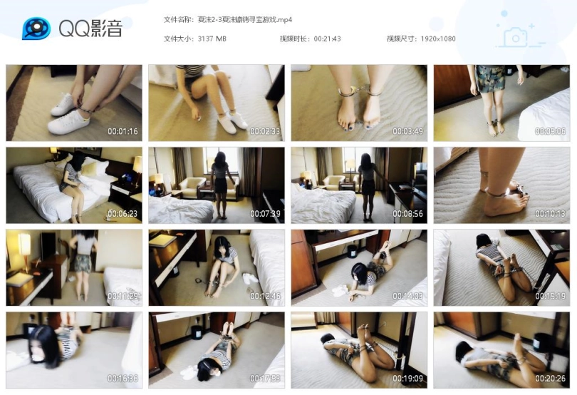 【视频时长】:00:21:42 【文件大小】:3137M 关键词:夏沫 镣铐寻宝游戏 手铐 脚铐 脚趾铐 休闲装 小白鞋 白袜子 妹子刚回来,看到了桌上的字条,有一个镣铐寻找游戏,找到哪些就把他们锁在身上。妹子觉得很好玩,决定参与。妹子找镣铐,先找到一把链铐,锁在脚腕上。然后找到一个链子脚趾铐,脱下鞋袜,锁在脚趾上。妹子慢慢行走,找到一个脚趾铐,锁在了脚上。妹子最后找到一个三通、手铐、长脚镣,决定玩个刺激的,在地板上驷马镣铐。袜子堵嘴,鞋放在头边上。趴在地板上,长脚镣拴住一只脚,手铐锁住手,三通锁上脚和连接手。妹子很享受整个过程,很开心。妹子觉得有点难受了,却怎么挣扎也弄不开,着急了,要哭了。 ![]() ![]() ![]() ![]() ![]() ![]() ![]() ![]() ![]() ![]() ![]()