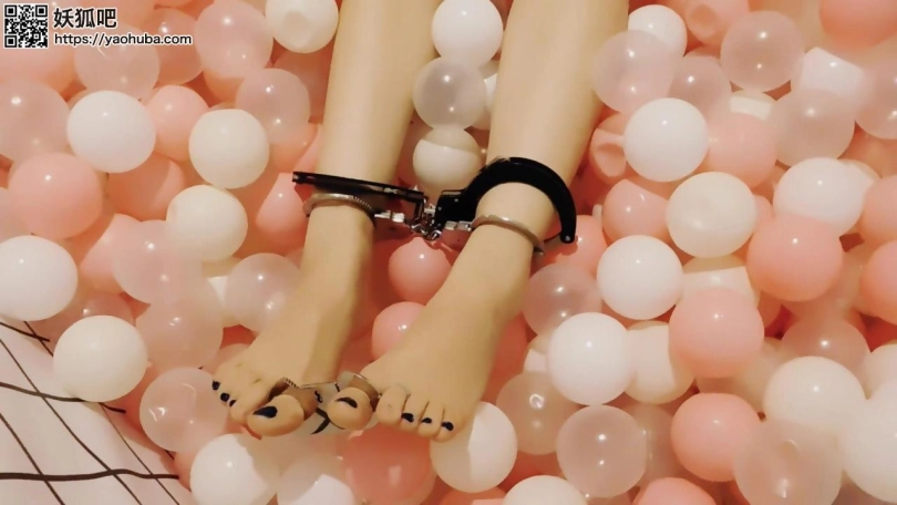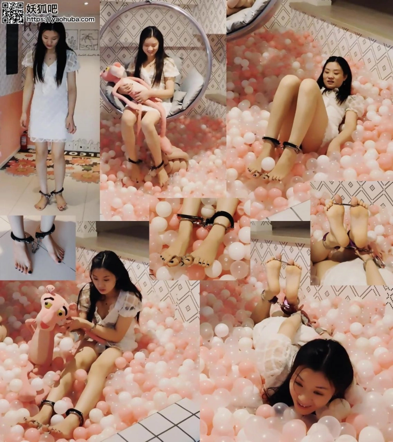 妹子回到家,戴上脚镣走上楼,玩海洋球,再戴上脚铐、脚趾铐、手铐。当她想解开的时候发现没有钥匙,朋友忘了给他钥匙。朋友来给送钥匙,正好撞上妹子在玩,于是绑成驷马,挠脚心玩耍。