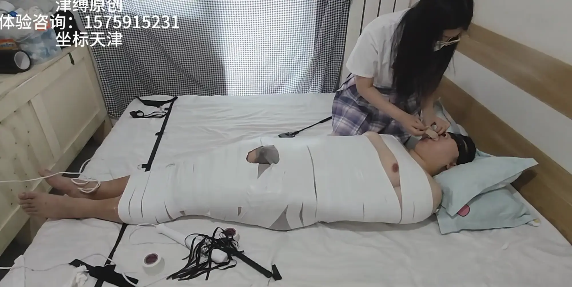 动不了了吧?看你还怎么跑,既然来玩了,那就别走了,什么时候被榨干,什么时候放开你!粉丝被胶带木乃伊化+郊狼电机+原味堵嘴+原味鞋子