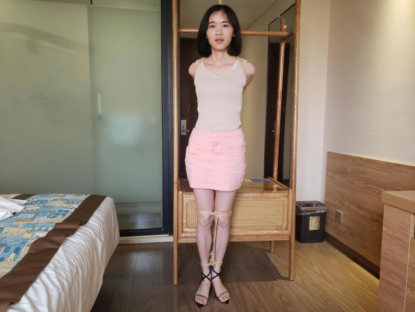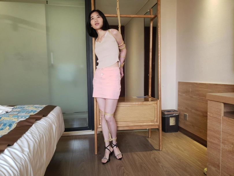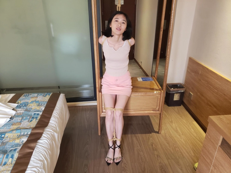 突发奇想把嫔嫔绑了个直臂,然后吊在晾衣架上,穿着高跟鞋,把腿脚绑住站着也累,坐着手右被吊起来很高,这姿势确实很难受,哈哈哈!