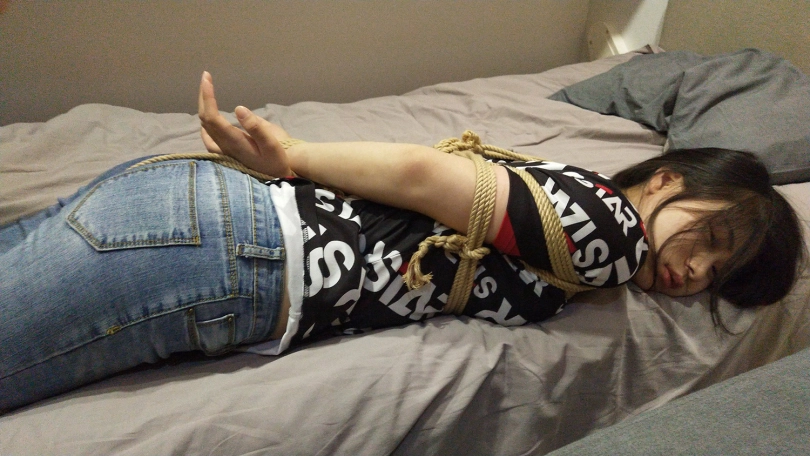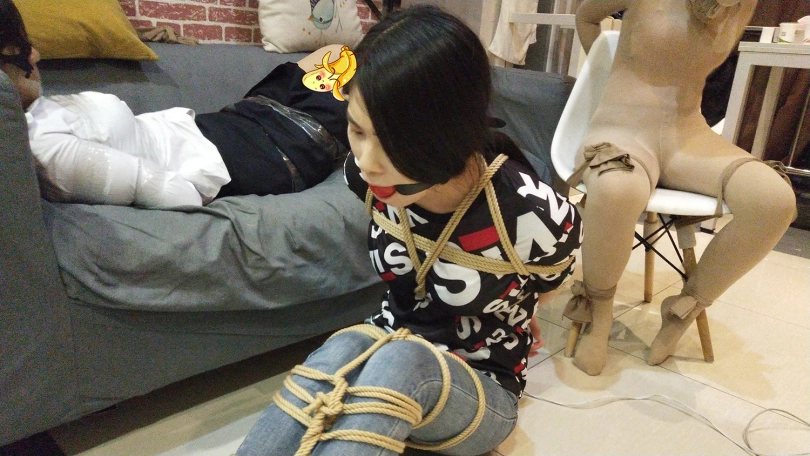 小冷:牛仔裤,休闲装,全身被绳子紧紧束缚,嘴里塞着口球;
