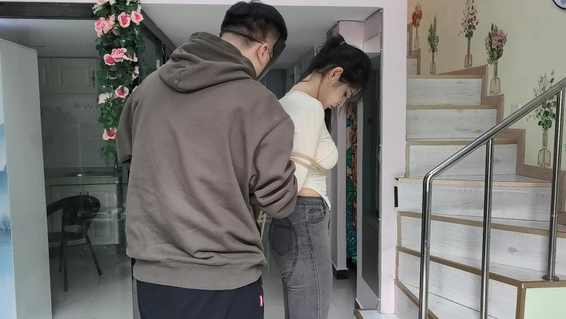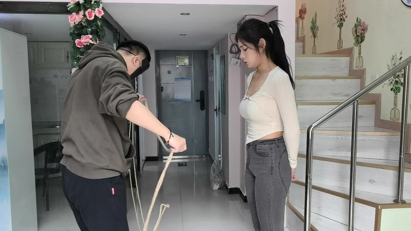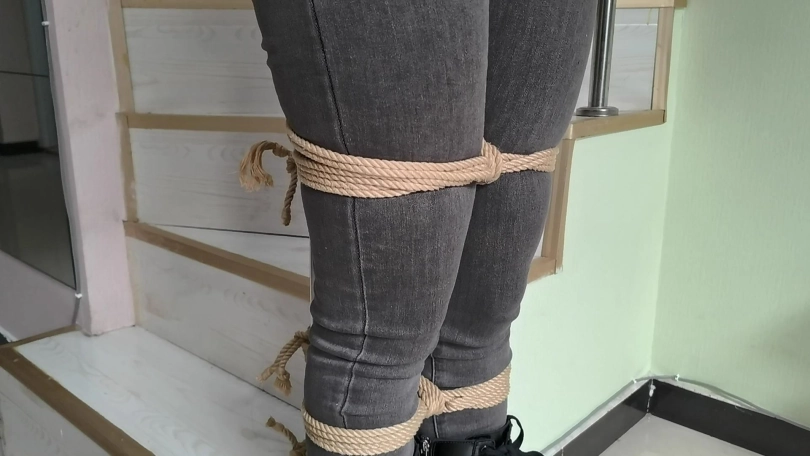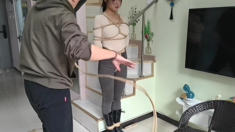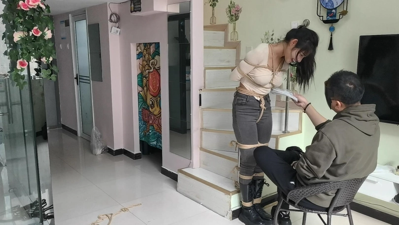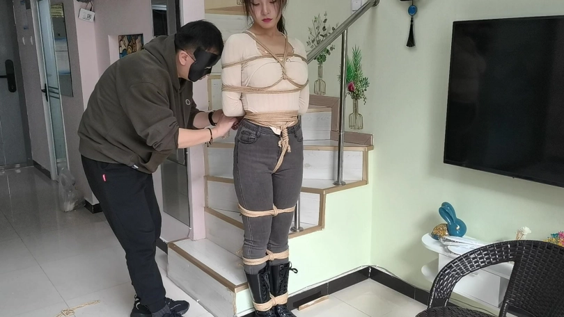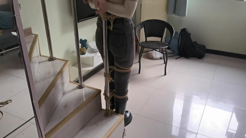 她穿者黑色长靴,上半身日式捆绑,股绳,把她绑在栏杆上固定。然后让她体验挠痒。。。