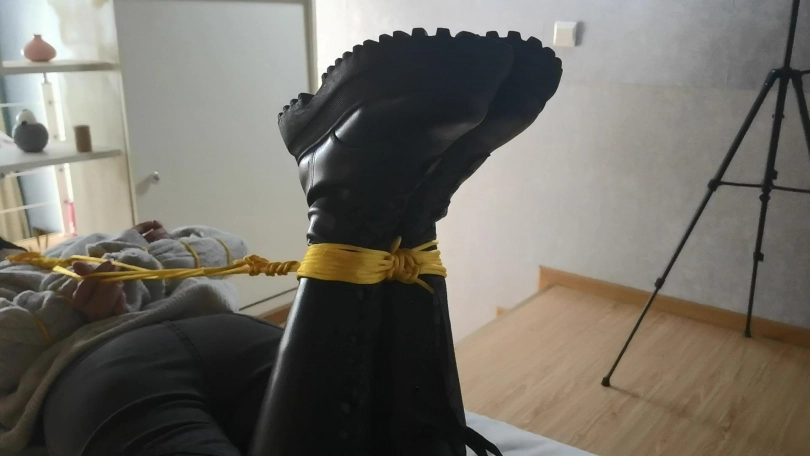 玖念穿着一双黑色长靴,用金黄色的绳子将她驷马捆绑在床上。嘴里用她穿过没洗过的袜子堵嘴,用绷带缠绕。玖念很怕痒,全身几乎每个地方都很敏感,稍微一触碰就会痒的不行,就连朝她肚子吹气她都会用反应。。。