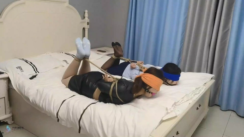 两名女孩回家,脱鞋[X_X]玩弄手机,玩累的她们睡了过去。这时一名歹徒闯进来,将两人捆绑起来。眼镜也给蒙上,嘴里都塞着口球。歹徒找到了一张银行卡,逼问密码。妹子不说,开始挠她们的脚底。歹徒得到密码后扬长而去。两个妹子不断的挣扎,最终挣脱束缚报警。