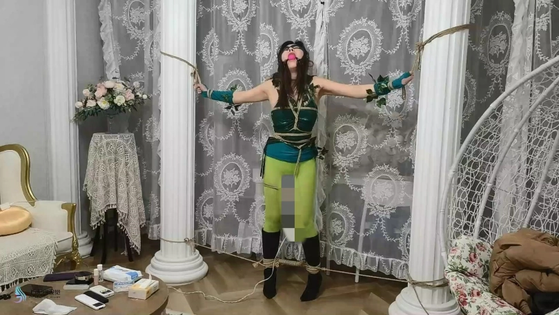 毒腾女用力的挣扎着,尖叫着,但很快她的嘴里就被塞进口球,绳子缠绕着一根电动棒子向她移动着,并固定在她的裆部。强大的震动感觉刺激着毒腾女,她无力的发出“呜呜”声。她祈祷着女侠过来拯救她。。。