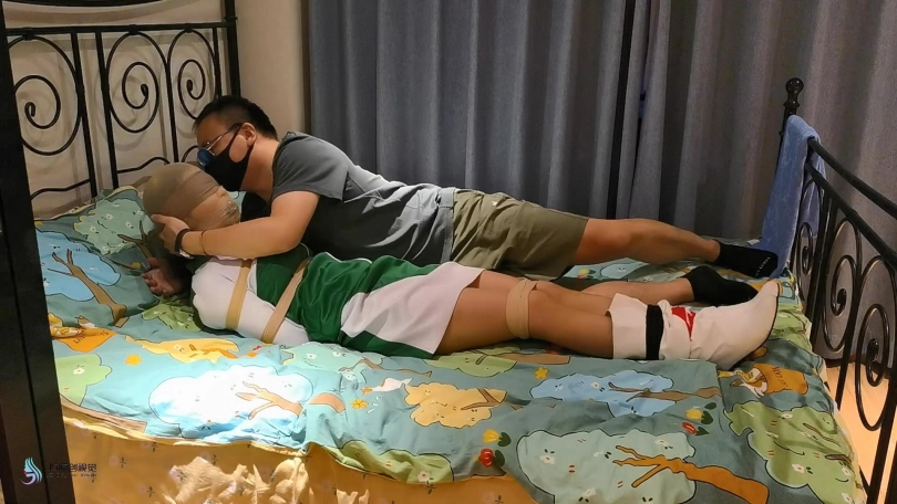丝袜推销员上门推销丝袜,对方见夏瑾很漂亮见色起意,以试下丝袜弹性为由让她把自己的脚绑上,又绑住了她的手。这是客户原形必露,开始对夏瑾动手动脚。夏瑾想离开却被对方用丝袜塞进嘴里,用胶带缠绕,防止她吐出来。用丝袜套在她头上,蒙住她的眼睛,用多条丝袜对夏瑾加固捆绑。男人将她抱起放在床上,脱下她的靴子,贪婪亲吻她的丝袜美足,并用郊狼电击片贴在她的大腿内侧和脚底折磨着她。