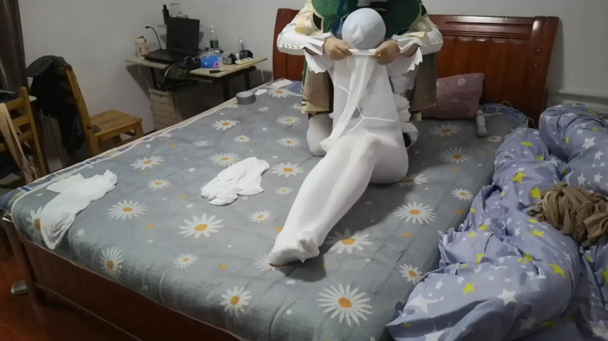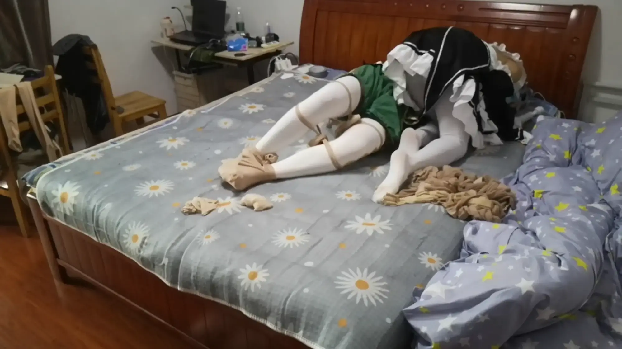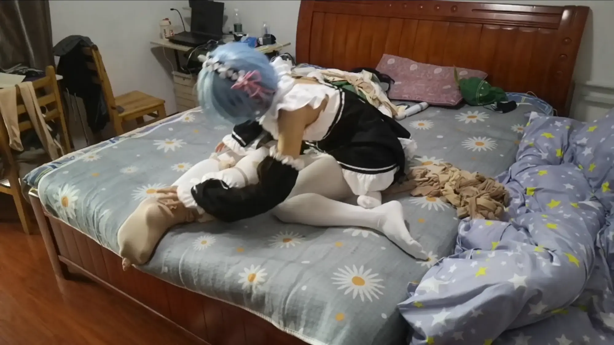 蕾姆为温迪准备了他喜欢的苹果酒,看着温迪品尝饮料,心里却想的是品尝温迪。将他用丝袜捆绑之后亵玩挠脚,奈何中途被温迪挣脱束缚,反被自己的迷药拿下随后丝袜套头全包,温迪逃走。