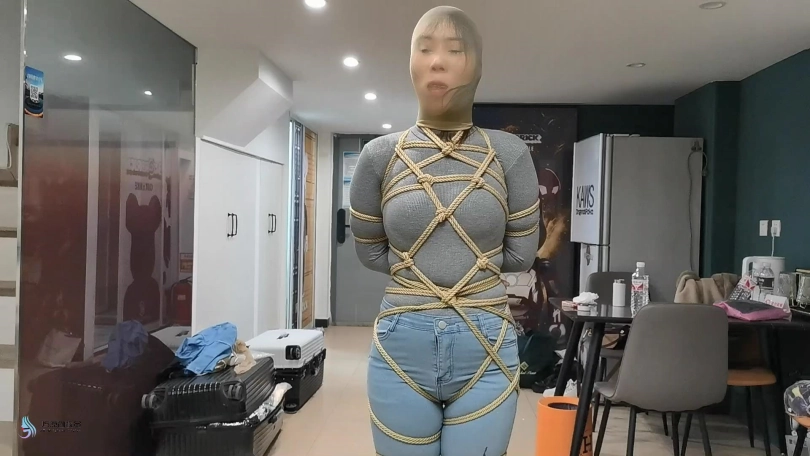 女人身穿牛仔裤和奶白色牛仔靴,用绳子将她全身密集的捆绑起来。嘴里塞着丝袜,在用丝袜头[X_X]在她头上,再用胶带缠绕她嘴巴,防止她吐出嘴里的丝袜。再给她戴上一个口罩,这样能限制她发出的声音。将她绑在柱子上固定好。开始抚摸她的胸部和裆部挑逗她,看火候差不多了,脱下点她的裤子,露出裆部,分别用两个棒棒轮着刺激着她的裆部,很快女人就释放,发出享受的呜呜声。