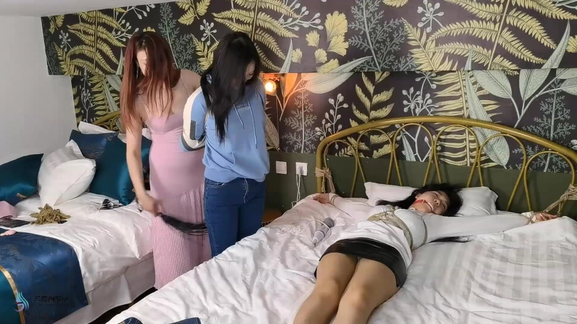 【视频时长】:01:03:25 【文件大小】:2943MB 劫匪:露楠 女孩:妙一 闺蜜:哈妮 女劫匪伪装成外卖敲门,女孩将门打开,女匪拿出毛巾将女孩捂晕过去。女孩醒来发现自己双腿被折叠跪绑在地上,上身被身子吊起,两腿分别被两边绳子固定住。这时女匪走过来问家里钱在哪里,女孩不肯说,女匪拿来毛巾塞进女孩的嘴里,在用口球堵嘴,并对女孩说:“我有办法让你自己说出来。”说完女匪用棒棒刺激着女孩的裆部,在女孩的胸部放上TD并用胶带固定着。强烈的刺激上女孩疯狂的扭动着身体并发出呻吟声。没一会就晕了过去。 女孩的闺蜜过来做客,敲门后发现房门自己开了,去不见人出来。闺蜜好奇的走进放进呼叫着女孩。女劫匪从后面用毛巾捂住闺蜜的的口鼻,很快闺蜜也被放倒。。。 女劫匪扛着晕着的女孩放到床上,上身龟甲捆绑并大字将她绑在床上。女孩醒来,女匪说:“我再问你最后一遍钱在哪里?”但女孩还是不说,随后女匪用鞭子抽打她,后面索性将女孩的丝袜撕烂。随后继续用棒棒进行刺激,然后脱掉了女孩的靴子和丝袜。女孩觉得很羞耻,被脱掉袜子后将两腿夹紧。这时女匪扛着女孩的闺蜜归来,她将一个TD放进闺蜜的裆部,并抽打着闺蜜,一边对女孩说:“再不说,就让你闺蜜替你受罚。” 当画面再次亮起时,闺蜜的牛仔裤已经被脱掉,女孩也被换上了新的丝袜。女孩和她闺蜜被面对着捆绑再椅子上。两人嘴里都被塞着丝袜,外面带着口球。闺蜜的双手拿着棒棒对着自己的裆部,并用胶带和绳子让她保持这个姿势。闺蜜的一只脚上用胶带缠着一个TD对着女孩的[X_X]。而闺蜜的另外一只脚放在了女孩的脸上并用绷带缠绕固定。两人就这样被[X_X]不断刺激着,而女孩随着每次呼吸,都能无奈的闻着她闺蜜黑丝脚丫的味道。 过了一段时间,女劫匪走来对着女孩说:“现在你想把钱给我了吗?”女孩被弄的早就受不了了,疯狂电点头同意。但女匪说:“你答应我迟了,需要给你们些惩罚。” 两个女孩堵嘴物被取走,她们双手被丝袜套着,脖子上戴着项圈,双腿被绑在一起,女匪牵着项圈上的链子,带着她们爬进了卧室。。。 ![]() ![]() ![]() ![]() ![]() ![]() ![]() ![]() ![]() ![]() ![]() ![]() ![]() ![]() ![]() ![]() ![]() ![]() ![]() ![]() ![]() ![]() ![]() ![]() ![]() ![]() ![]() ![]() ![]() ![]()