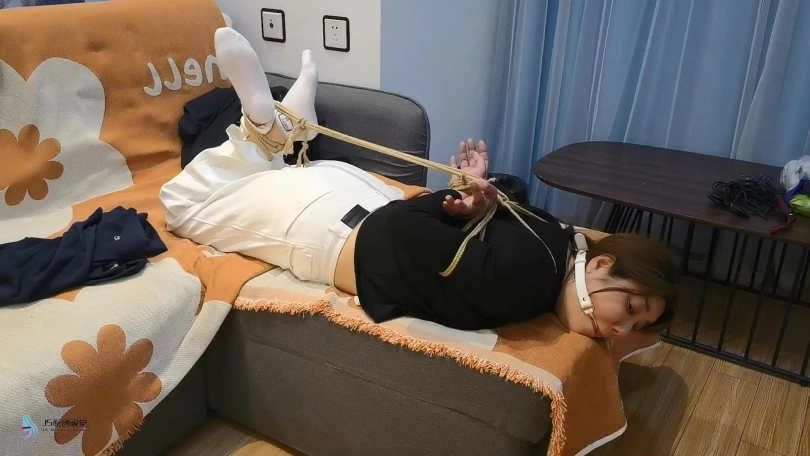 一名劫匪闯入了少妇的房间,少妇回到家中被劫持。劫匪将少妇驷马捆绑再沙发上,嘴里塞着口球。她的鞋子被脱掉,露出一双白袜脚在无力的挣扎着。劫匪将少妇捆绑在椅子上,用丝袜塞进她的嘴里,在用丝袜缠绕嘴巴,防止她吐出袜子。劫匪开始挑逗着少妇敏感区域,用棒棒刺激着她。劫匪拿来她穿了一天的鞋子,扣在她的脸上,并用胶带缠绕。让她被迫的闻着自己鞋子的味道。最后劫匪准备将少妇打包抗走。