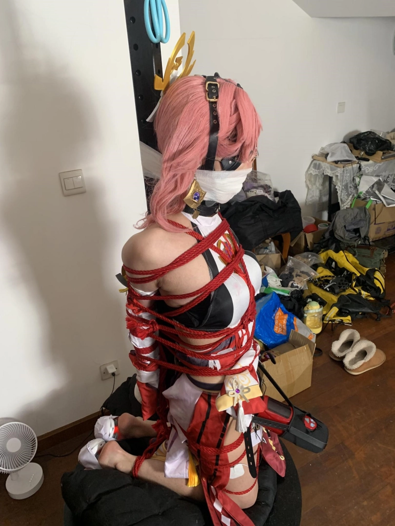 蒙眼堵嘴,双手被胶带包裹,全身被紧缚起来,腋下和脚底还用胶带缠绕上了按摩器,前面套上斐济杯狠狠榨汁,直到糕巢