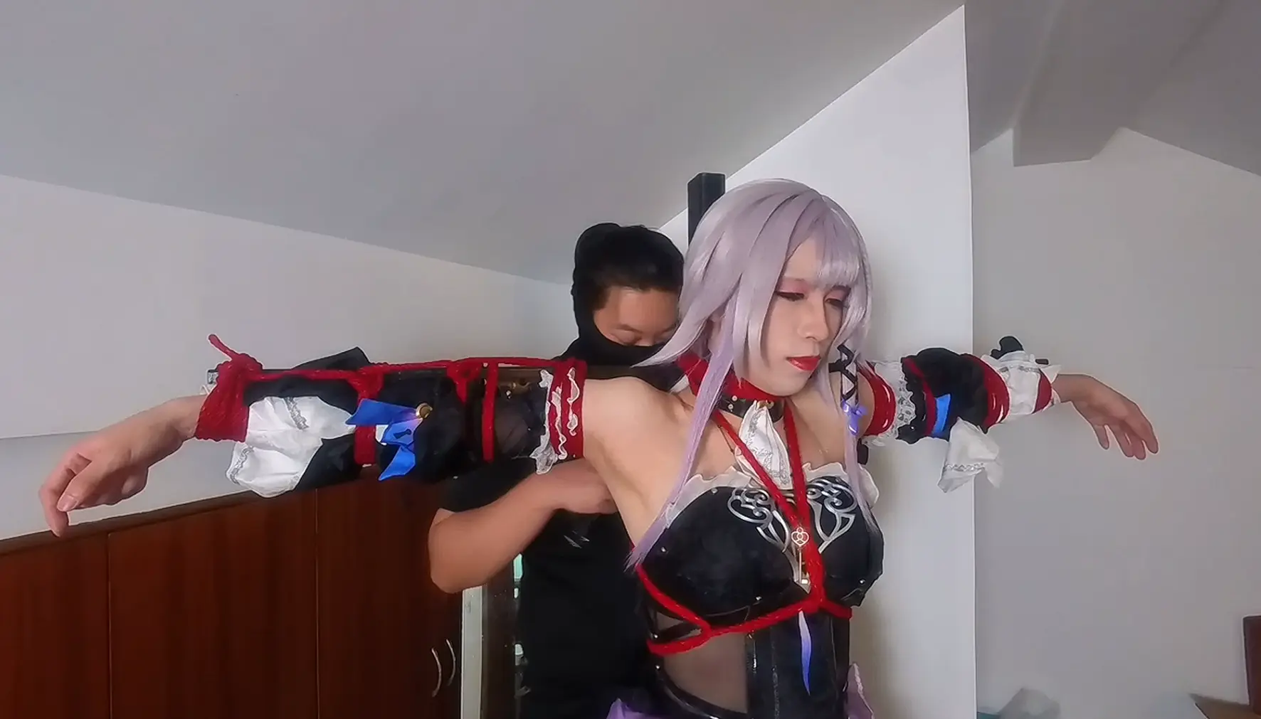 不仅被红绳紧缚在十字架上,腋下暴露出来后还被胶带缠上了按摩器,又疼又痒只能受着这样的酷刑
