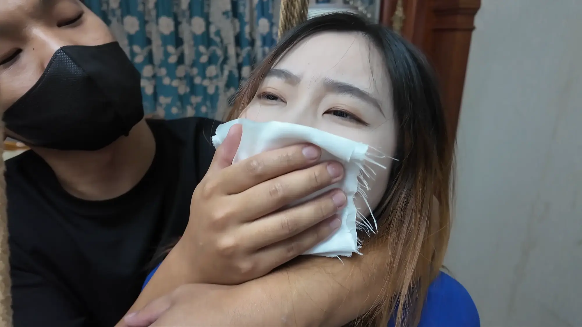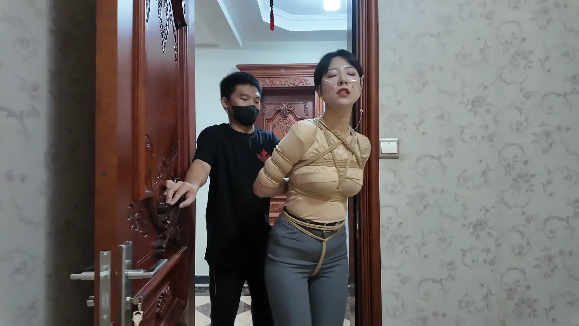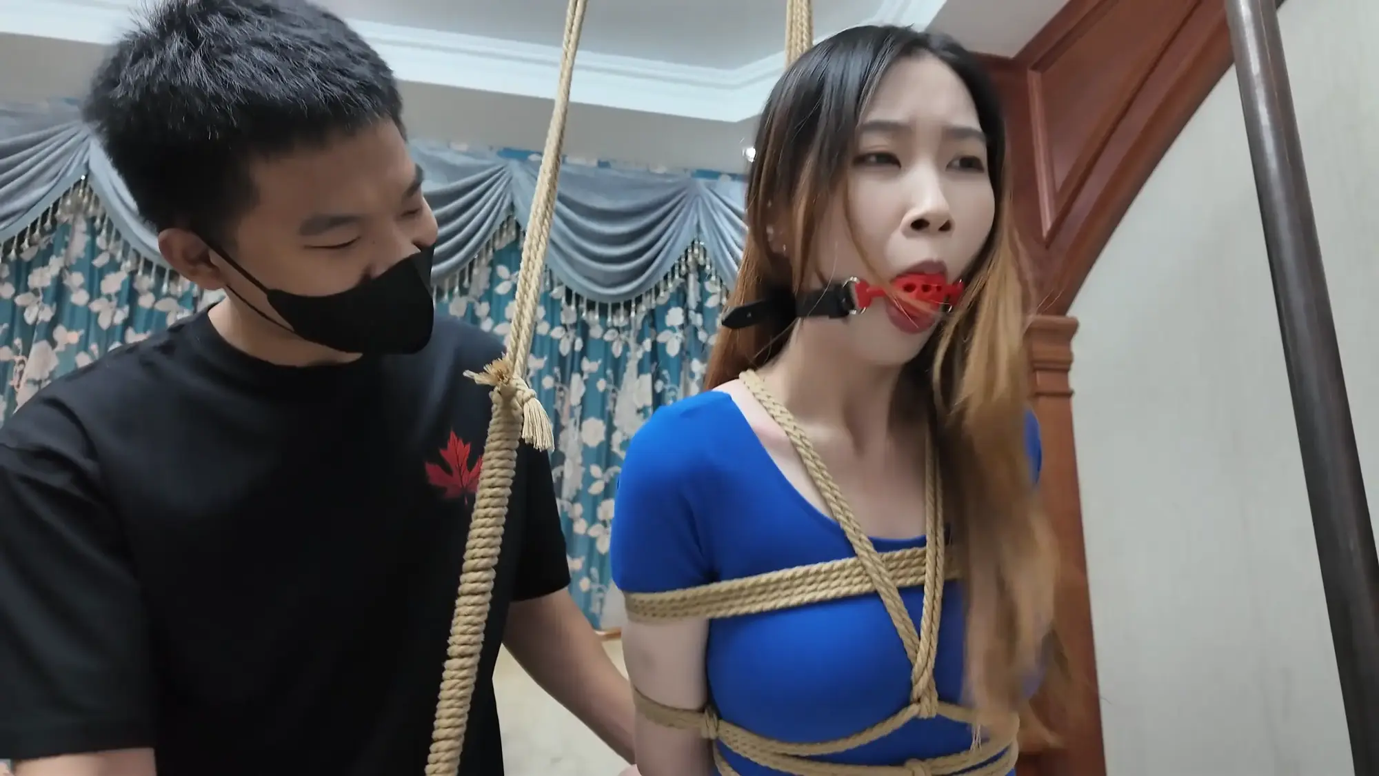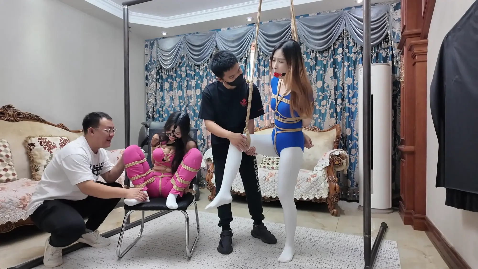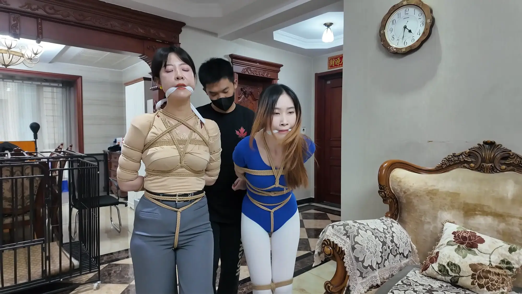 【视频时长】:00:39:08 【文件大小】:2404MB 米粒和佳雯对剧本的理解都很精准,完全代入了角色,尤其是米粒扮演的e小姐,笑面虎和媚女的形象切换演绎的淋漓尽致,佳雯则是稳定发挥,把本系列中雷姐角色泼妇毒蛇的形象塑造的极为形象,南清虽然演技上不如前两位,但进步也是肉眼可见的,尤其是说台词和敢直视镜头这两个方面,希望再接再厉。 前情提要,南清探员逃跑失败,再次被雷姐的手下抓住,雷姐也被自己的手下背叛。此后,南清与雷姐被囚禁起来,两人分别被换上体操服与瑜伽服遭受折磨。某一日,南清被单腿吊缚,雷姐则是头戴马具,嘴塞口球,m字开腿坐在椅子上,两人照常被两个男人玩弄,小弟表示马上就要把她们卖掉有些舍不得,大哥告诉他自己准备黑吃黑,钱和人自己都要,并说利益最大化是雷姐教给自己的,看到雷姐依旧瞪着自己不肯屈服,大哥开始用力锤击雷姐的腹部,并拉扯雷姐的股绳教训她,一旁的南清也一样不服气,被拿掉口球后依旧放狠话要杀了他们,两个男人大笑嘲讽,小弟拿起鞭子开始教训南清。过了一会儿,大哥的手机发来买家的短信,他命令小弟把南清和雷姐捂晕关到卧室里,一切准备妥当后,大哥让小弟下去接人,自己做好偷袭的准备。 画面一转,e小姐出场(米粒扮演),她提着箱子边走边接起电话,电话另一边的老大命令e小姐拿到获取后就把卖家干掉,e小姐轻蔑一下说一定完成任务。e小姐与小弟会面,被小弟带上了楼。刚刚走进屋子,e小姐就察觉到了不对劲,并让躲在角落里的人出来。随后大哥拿着枪走了出来,夸奖e小姐是个狠角色并且还是个大美人,e小姐表示他们胆子不小敢黑吃黑,并告诉他们如果让自己的老大知道他们怎么死的都不知道。小弟不耐烦的让e小姐放下箱子,双手背后站在一边。e小姐淡定自若的照做,并用充满挑逗的口气说不开枪杀了自己,摆这个姿势是不是要绑。小弟验完钱后大哥回应e小姐本来是准备一枪干掉她的,但实在舍不得杀掉眼前的大美人,于是大哥命令小弟拿绳子去,将e小姐紧密捆绑了起来(捆绑过程全记录),捆绑的过程中e小姐不停挑逗眼前的两个男人,把两个人迷惑的神魂颠倒,但为了保险起见,大哥先让小弟把米粒关起来,慢慢料理她。 e小姐被带到了关押南清雷姐的房间,小弟拿掉南清雷姐的口球让她们聊聊天,雷姐刚被摘掉口球就开始痛骂,被小弟教训了之后暂时老实了下来,坐在一旁的e小姐嘲讽雷姐被自己的手下背叛滋味不好受吧,雷姐惊讶的问她怎么知道这些的,而思维敏捷的南清直接猜出了e小姐的身份,并问她是不是被黑吃黑了,e小姐起身夸奖南清,并疑问南探员这么厉害的角色是怎么被抓到的,而南清则是反嘲她又是怎么被抓到的,e小姐一脸妩媚的弯腰凑近南清说都是为了得到南清才亲自出马的,结果被南清呵斥骂开,一旁的雷姐嘲笑e小姐只会嘴硬,还夸南清骂的好。e小姐突然变脸一脚踩在了雷姐的腹部上,辱骂她丢了同僚的脸,雷姐也不甘示弱骂了回去,南清则是在一旁劝架。听到吵闹声的两个男人跑了进来,拉开了e小姐。e小姐又突然变脸,一脸娇羞对着两个男人撒娇,并请求能不能把绳子松一松,看到这个情景的雷姐和南清都露出了不可思议的表情,辱骂e小姐不要脸。大哥表示既然她们三个都火气这么大,就帮他们泄泄火,南清雷姐e小姐被布条勒嘴带出了房间,站在一起的雷姐与e小姐依旧互不相让,用身体撞对方,被大哥拉开。三人被强制按倒在地用皮鞭抽打... 结尾下集预告,雷姐被脱掉外衣,内衣捆绑;e小姐挣脱束缚对峙面具男被石头击落手中的手枪;e小姐南清雷姐再次被捆绑起来,被神秘人拉着绳子带走。 ![]() ![]() ![]() ![]() ![]() ![]() ![]() ![]() ![]() ![]() ![]() ![]() ![]() ![]() ![]() ![]() ![]() ![]() ![]() ![]() ![]() ![]() ![]() ![]() ![]() ![]() ![]() ![]() ![]() ![]() ![]() ![]() ![]() ![]() ![]() ![]() ![]() ![]() ![]() ![]() ![]() ![]() ![]() ![]() ![]()