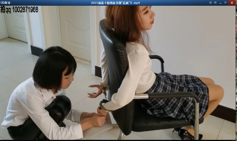 【视频时长】:00:29:40 【文件大小】:1317MB 女病人为了找医生开病假单,把两腿穿进一条裤腿里装作腿脚不好,被医生识破,又骗医生说自己感染肺炎,两人之间斗智斗勇。 人物:女病人,女医生 服装:医生穿白大褂,里面穿什么随意。女病人穿皮裤,两腿套在一条裤管里,另一条裤管绕在腰间,藏进毛衣里。上身穿羽绒服或者大衣。脖子上戴一条围巾。 束缚方式:先是医生把女病人反手铐住,女病人找到钥匙后,反过来把医生铐住,用绳子捆绑医生的双腿。 情节 第1部分 看病 “医生快救救我!”门被推开了,进来一位女病人,迈着小碎步走进房间。 女医生:“你怎么了?别慌,坐下慢慢说。” 女病人坐下后:“医生,我病了,我想开一周的病假单。” 医生:“病假是你想开就开啊?我看你活蹦乱跳的这么有精神,怎么给你开? 女病人:“我真的有病。我今天突然走不动路了。” 医生:“哦?你走两步我瞧瞧” 女病人站起身迈着小碎步,在医生面前艰难地来回走了几步:“今天不知怎么了,腿也迈不开了。” 医生围着女病人观察了一圈,说:“你腿没病,你裤子穿错了。” 女病人摸了摸自己的腿,这才发觉,一脸尴尬。 医生:“好了,既然没病,你就出去吧,我忙着呢。” 女病人:“不不不,我有病,我突然又呼吸困难。” 医生又在病人脖子处看了一下,帮她解开围巾,“现在呼吸通畅了吗?” 女病人:“谢谢医生,现在好多了。” 医生觉得自己被戏弄了,有点生气:“我说,你明明没病,来这里存心捣乱的是吧?” 女病人:“医生,我不是来捣乱的,我上班太累了,想休息一周,你就行行好,给我开病假单吧。” 医生:“不行就是不行,走走走,你别呆在这儿浪费时间,我还有其他病人呢!” 女病人见医生不答应,也生气了,说:“你不肯是吧,那我告诉你,你今天开也得帮我开,不开也得帮我开!” 医生:“你想怎么着?” 女病人:“哼哼!我老实告诉你吧,我染上肺炎了,看你给不给我开病假!” 医生猛地从座位站起来:“什么?!感染了还不早说?好好好,你就等着被隔离吧。” 女病人说:“我才不要被隔离,我明天还要去外地旅游呢。” 医生抓住女病人的肩,说:“这可由不得你了。” 女病人不从,两人推搡起来,最终,医生拿出一副手铐,把女病人双手反铐在身后。 女病人被医生按在座椅上坐下,挣脱不开,急道:“你一个医生怎么会有手铐?” 医生狠狠地说:“就是为了对付你这种人的。你就给我老老实实呆着,我叫人来把你带走。” 医生说完出了门,把女病人反锁在诊室内。 第2部分 意外 女病人戴着手铐,挣扎不开,打开医生的抽屉,竟然轻易地找到了手铐钥匙,给自己解开。 当她想打开房门出去时,却发现门被反锁,打不开。只能在房间里到处翻找,看看有什么东西能把门打开。 女病人翻找了一会儿,突然门被打开,医生进了房间。 医生见到屋里被女病人翻得乱七八糟,急道:“你在干嘛?” 女病人被吓了一跳,心虚地问:“啊,我没干嘛。对了医生,你这么快就回来了,人没叫来吗?” 医生说:“没来,路上堵,估计还要等一小时才能到...........诶?等等,你手铐怎么打开的?” 医生边说着边上去查看,不料被地上散落的杂物绊倒,摔了个眼冒金星。 第3部分 反转 女病人赶忙把医生搀扶起来,到座椅上坐下,关切地问:“医生,你还好吧?摔疼了吗?” 医生坐在椅子上,舒了口气说:“还好,就是摔得有点疼。哎呦,你让我休息会儿。” 女病人:“医生,我家有祖传功夫,我给你按摩一下你就不疼了。” 医生:“原来你也会医术啊,那快点。” 女病人给医生按摩了一下脚踝,说:“现在脚不疼了吧,我来给你包扎一下!” 医生被按摩的很受用,舒服地闭上眼睛,仰头靠在椅背上说:“行啊。” 女病人坏笑着拿来一条绳子,把医生双脚绑了起来。 女病人又拉起医生的手,“我再给你手臂也按摩一下。” 按摩了没几下,就把医生双手拉到身后,悄悄拿起手铐,咔嚓一声,把医生双手反铐在背后。 医生这时仍然闭着眼仰头靠在椅背上,浑然不知。 第4部分 放置 女病人拿来纸和笔,拍了拍医生,微笑着说:“医生,这下你可以给我开病假单了吧?” 医生睁眼后,发现自己被绑了,怒道:“你这是干嘛?快给我松开!不然我可喊人啦!” 女病人用胶布捂住医生的嘴,说:“你别大惊小怪的,我刚才骗你的,我才没染上肺炎,你只要在病假单上签名就行了。” 医生无奈,只能用被铐的双手握笔,勉强地签了名。 女病人一手拿起病假单,一手拿起手铐钥匙,得意地说:“谢谢医生啦!那我走啦,对了,你这手铐钥匙就送给我吧。” 说着女病人走出了房间,留下医生坐在椅子上唔唔叫着。 之后就是女医生的挣扎时间,用各种姿势挣扎了很久,站着,躺着地上,跪在地上,等等各种姿势,最后终于扯下了堵嘴的胶布,解开了脚上的捆绑,但是由于手铐解不开,就这样跑出去求救..... ![]() ![]() ![]() ![]() ![]() ![]() ![]() ![]() ![]() ![]() ![]() ![]() ![]() ![]() ![]() ![]() ![]() ![]()