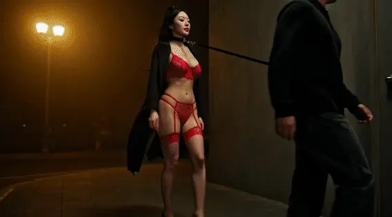 黑色蕾丝情趣内衣+狗链牵引 → 厕所内深吻+绳缚+口球强制吞咽口水