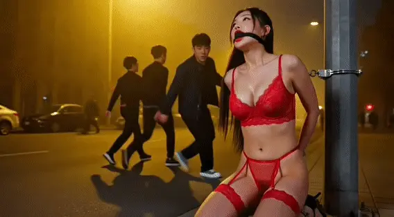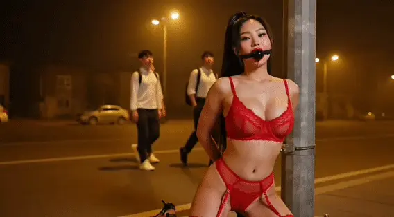 夜间无人的大马路公开遛狗,路灯下被绑在电线杆跪姿展示