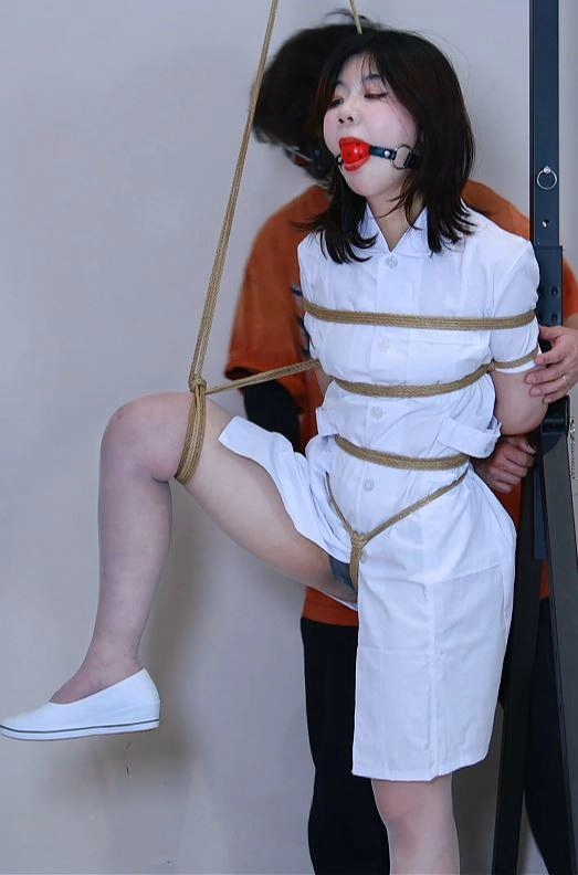 今天的角色是小护士,不得不说落叶同学穿什么像什么。先是单腿吊放上小玩具放置一会儿,让落叶同学带入角色,她口水是真的多如洪水,每次戴上口球口水流没停过,当然这也有小玩具的功劳。接着以一种极其羞耻的姿势把她绑在轮椅上,当然要涂上涩涩的婴儿油。这个姿势正好将落叶同学的美臀展示在我面前,真是让人忍不住蹂躏一番,双手头顶后背绑住也限制了她头的活动,所以她只能羞耻的看着自己被调教。戴上鼻钩爽到想翻白眼了,撕开封嘴的胶带,没错,里面正是她穿了三天的臭袜子。一定很喜欢自己的味道吧,两双袜子把落叶的小嘴巴塞的满满的。伴随着一声轻咳,我将袜子从她嘴里取了出来。在她没意识到自己是玩物之前,我要把她的舌头固定住,一直伸着小舌头保持羞耻感。经过我的训练,落叶已经被羞耻和紧缚的快感充斥大脑和全身。