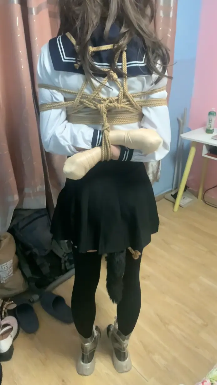 学生制服,短裙,黑丝过膝袜,透明短靴。前面穿戴好贞操锁,后面塞上尾巴,贴好郊狼,身体再被紧紧绑缚起来,披上斗篷就出门吧