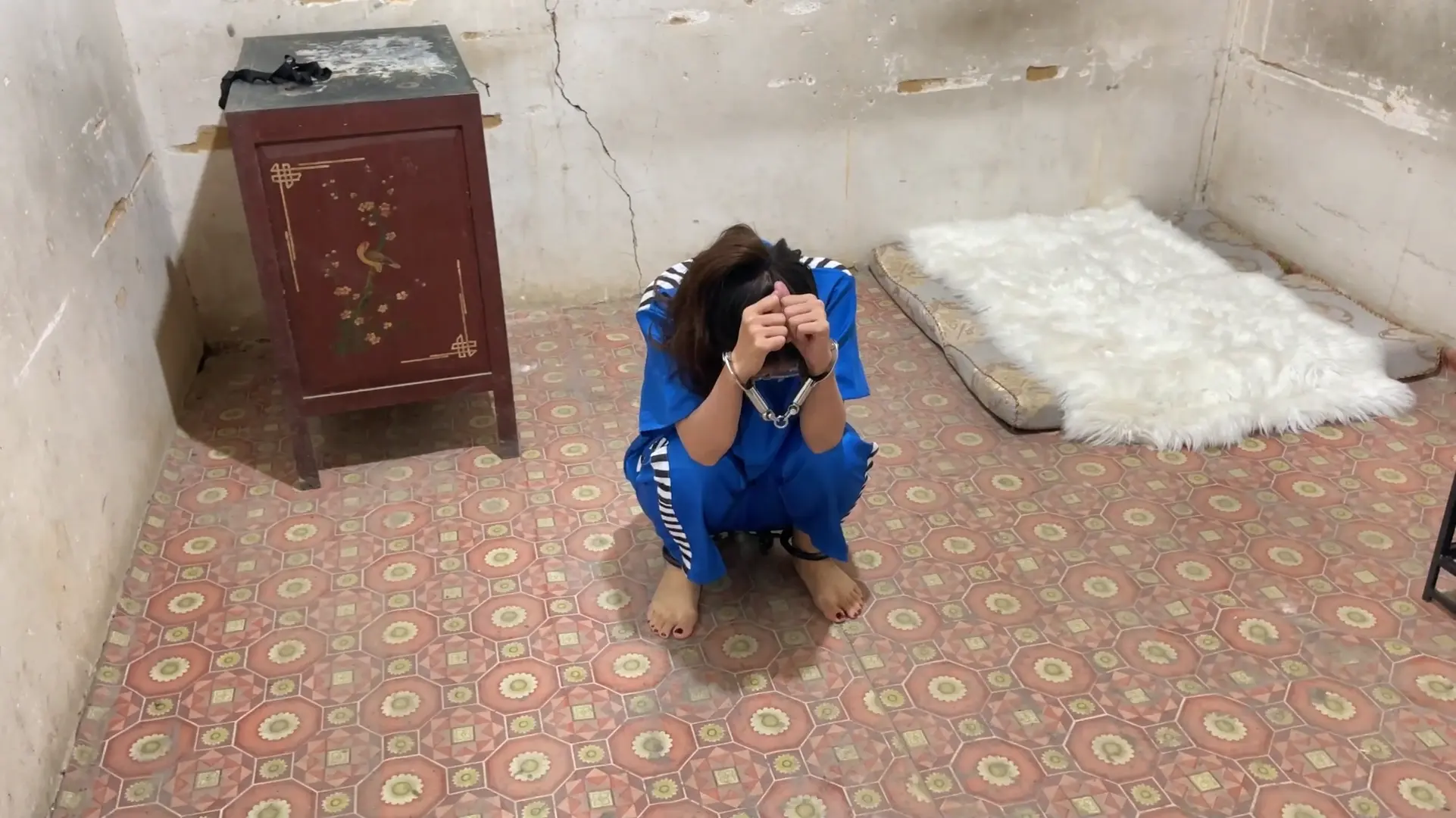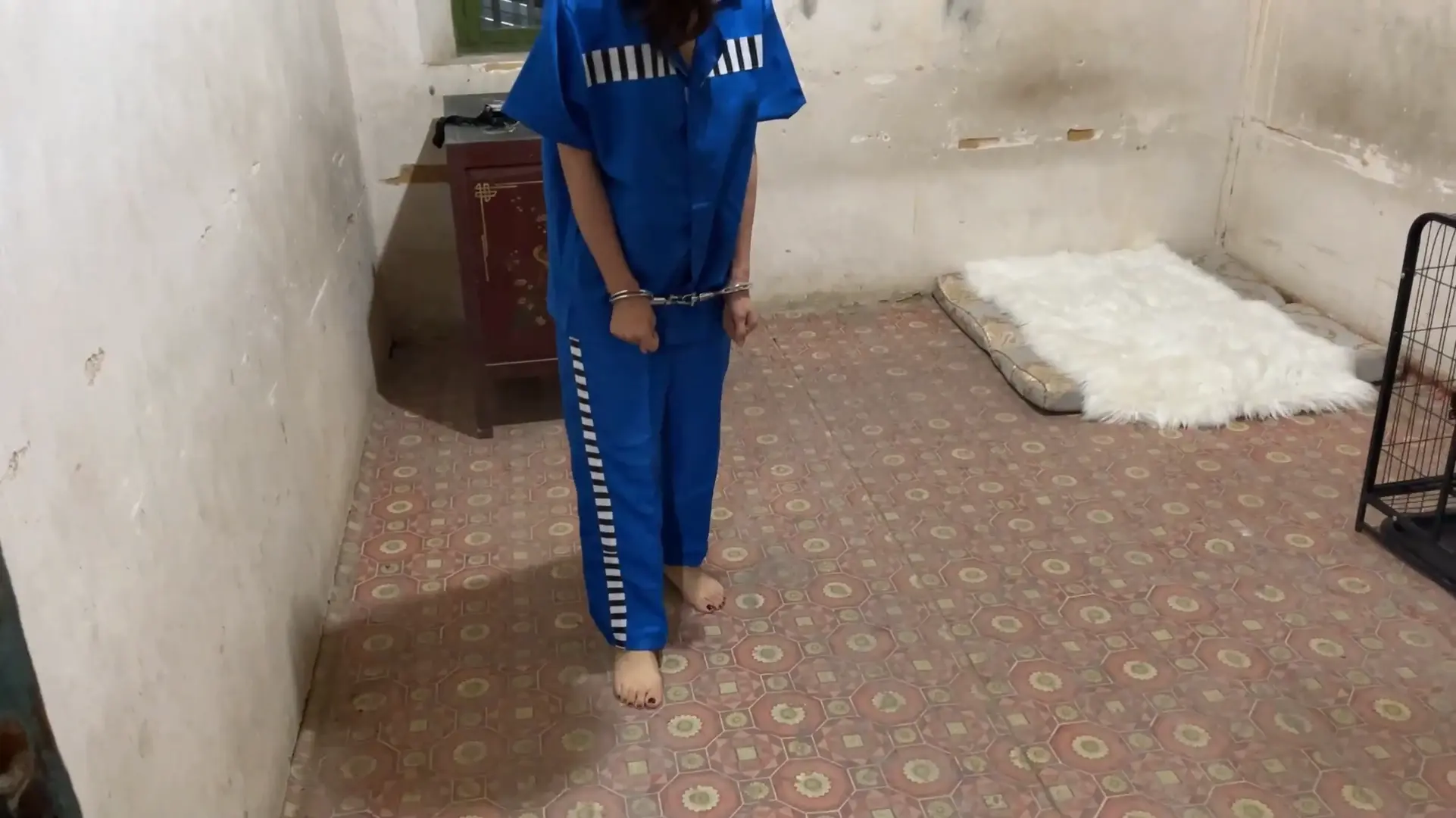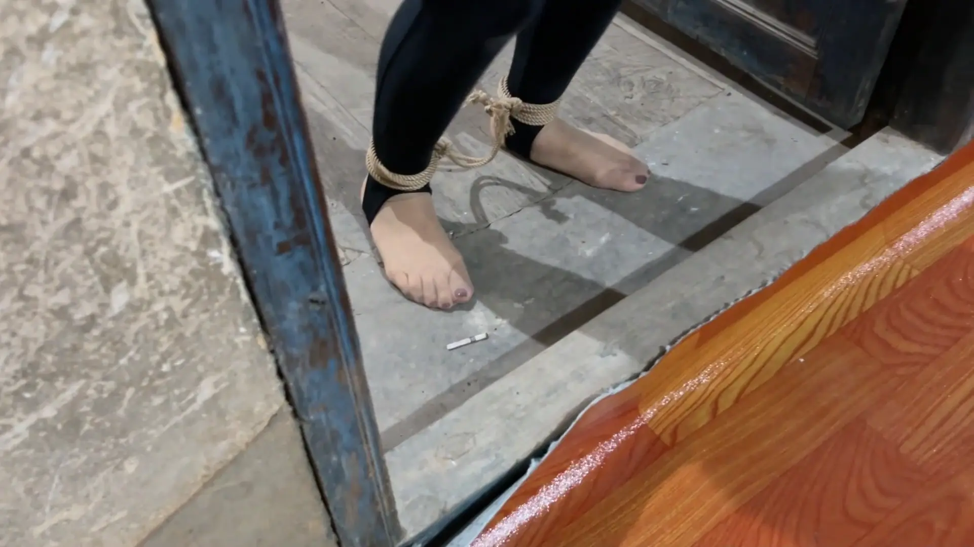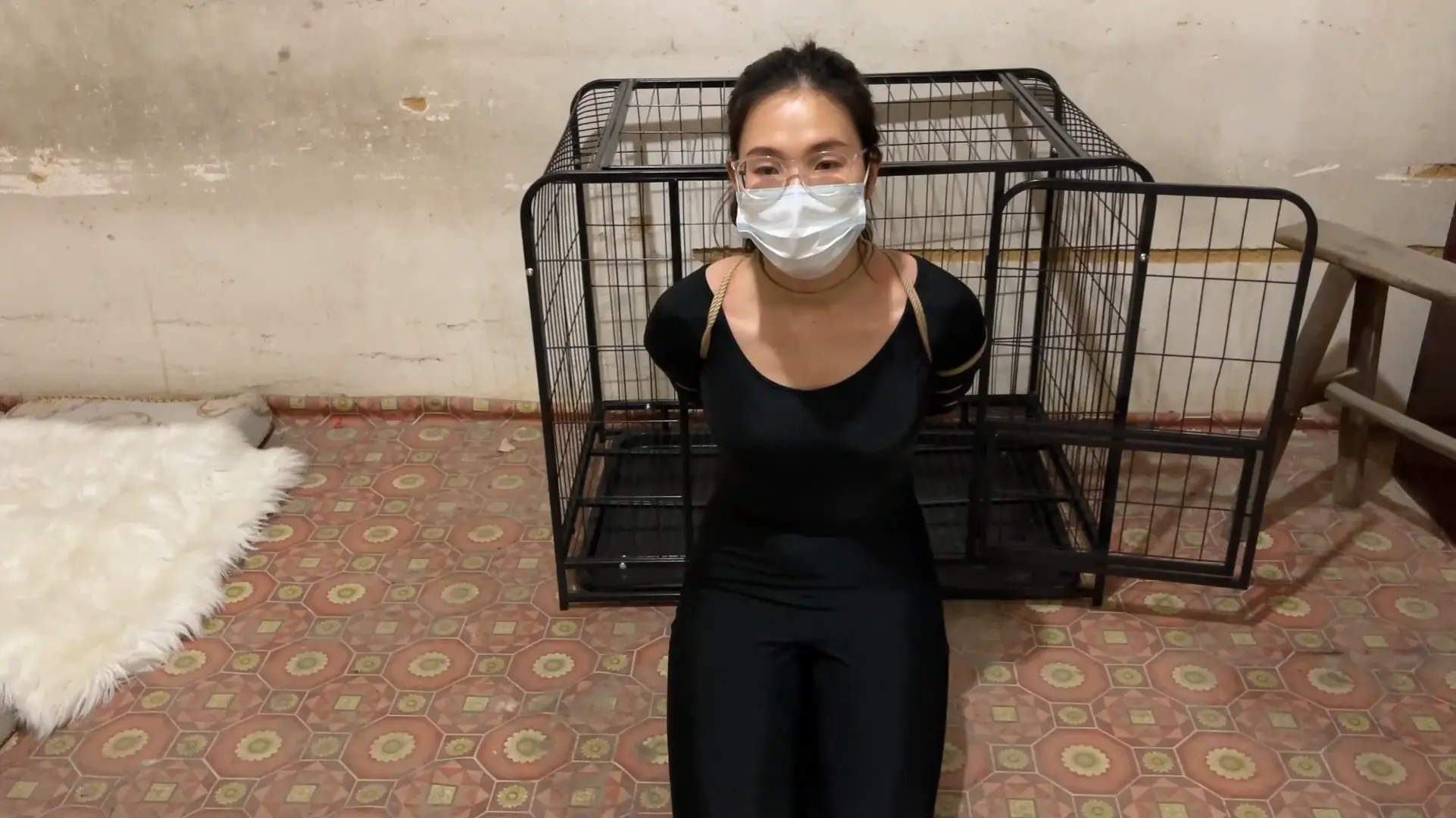 女囚洋再次上线,被执行死刑,身穿瑜伽踩脚裤肉色丝袜,身体被五花大绑,脚腕绑绊脚绳,押解执行死刑,进入刑场后拖鞋露出丝足,最后挣扎着跪下被执行