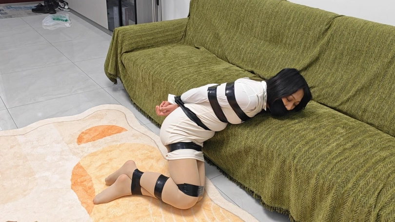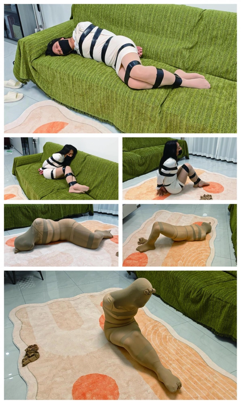绳子捆多了审美疲劳,那就来一次胶带紧缚吧,光用胶带还不够,两层丝袜包起来,就是给模特一种逃脱无望的感觉。