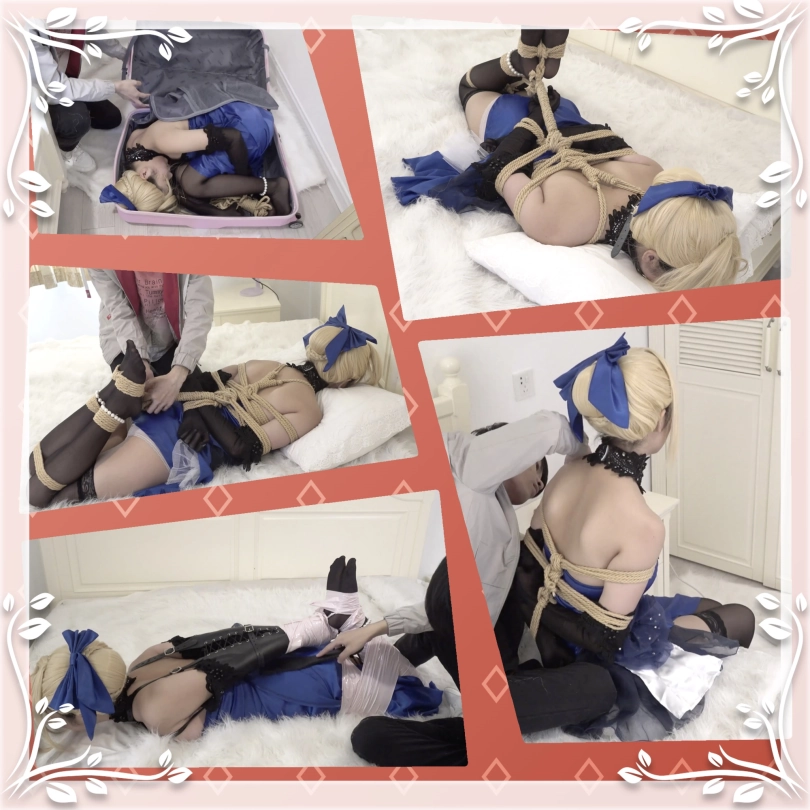 具体内容:一天男子在屋内玩着手机,门铃突然响了起来,男子走过去打开门,发现一个粉红色的行李箱摆在了自己的面前,男子打开箱子发现了黑丝的礼服saber,“主任。从今天开始我就是你的奴隶,请尽情捆绑我吧”saber说着拿出了绳子,男子开始了他罪恶的一生)——(坏笑)