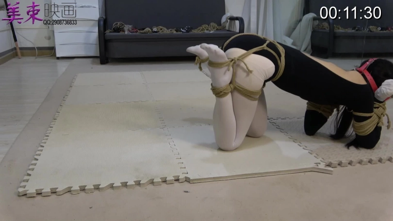 珊珊被绑成小狗狗,手脚都无法移动,只能在地上爬和无助的翻滚,然后被拉起股绳吊起来保持这个姿势,最后只好学狗叫求饶。