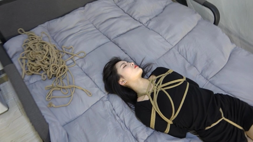 小美被我扔到床上,我细细地观赏了小美一番,给她脱鞋,摸了摸她的上身和双腿。随后我把麻绳也一一扔到床上,开始对小美进行捆绑。
