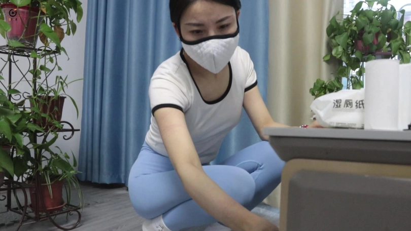 门铃响了,保洁小姐姐穿着长风衣,双手插在口袋里,身上挎着一个小包,脸上带着的白色棉口罩,眼睛带着笑容,但却一直不说话。。。。。