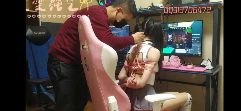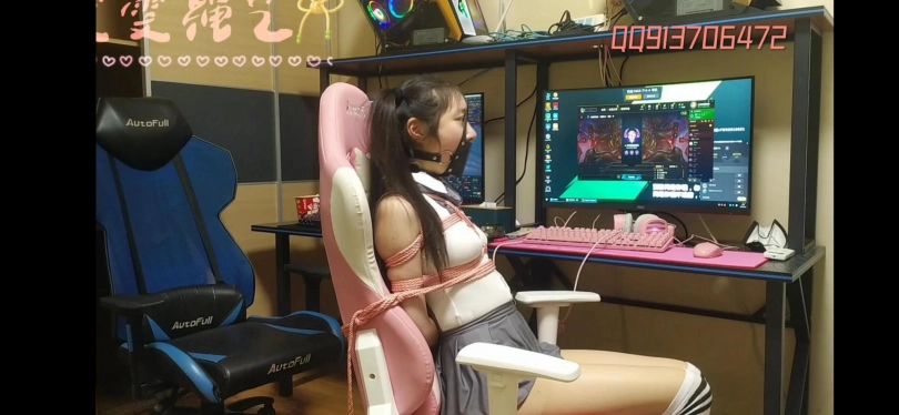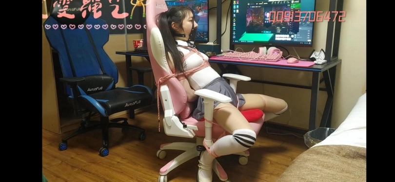 雯雯特别喜欢玩lol,主人为了惩罚她,带她开了电竞酒店,把她绑在电竞椅子上,戴上口塞,让她眼睁睁看着眼前的电脑而没法玩,让她憋屈难受心痒痒,我想这是对一个lol小迷妹最好的惩罚,最后给用了小td,让她更难受!