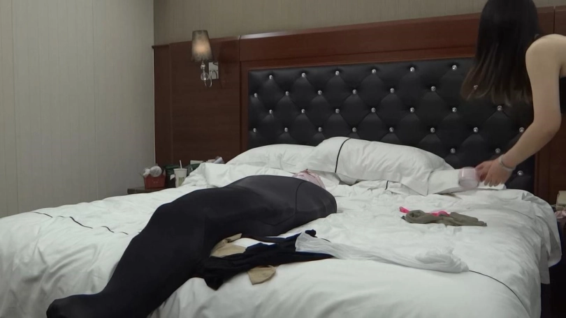 这次带了四条全包用的丝袜睡袋,本来想用到珊珊身上,没想到她来了兴趣非要把我绑进去,绑完就开始动手动脚,口球加她的臭袜子堵嘴,闻臭丝袜,闻脚丫子,挠痒痒各种折磨,最后还把臭丝袜直接用胶带粘在我鼻子上,堵嘴塞鼻子都是用的她上个星期穿的臭袜子,视频前几分钟是她穿这些丝袜的日常。