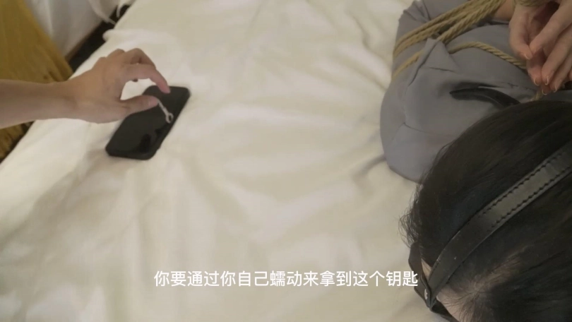挑战3.后手观音驷马放置在床上,带马具口球并用扎带向后拉强制抬头,在床上任意地方放一把钥匙,思思要在10分钟内用手拿到钥匙,否则任务失败。