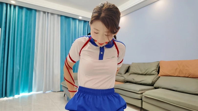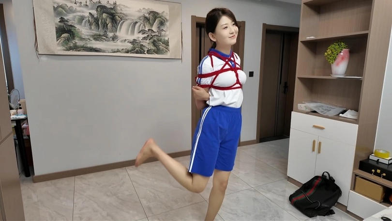 珊珊放学回家。拿出藏在书包里面的红色绳子,玩自缚,正好来了快递,收过快递,忘记了关门,被快递小哥看到,并拍下照片,威胁要老师知道,珊珊被迫无奈和快递小哥玩捆绑