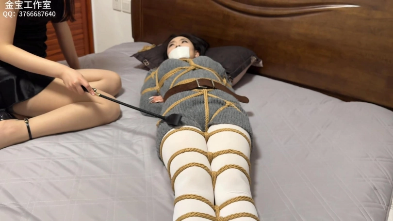 思琪将喵喵捆绑,并用胶带封嘴,随后对喵喵展开了调教:挠脚心、鞭打、上下其手。