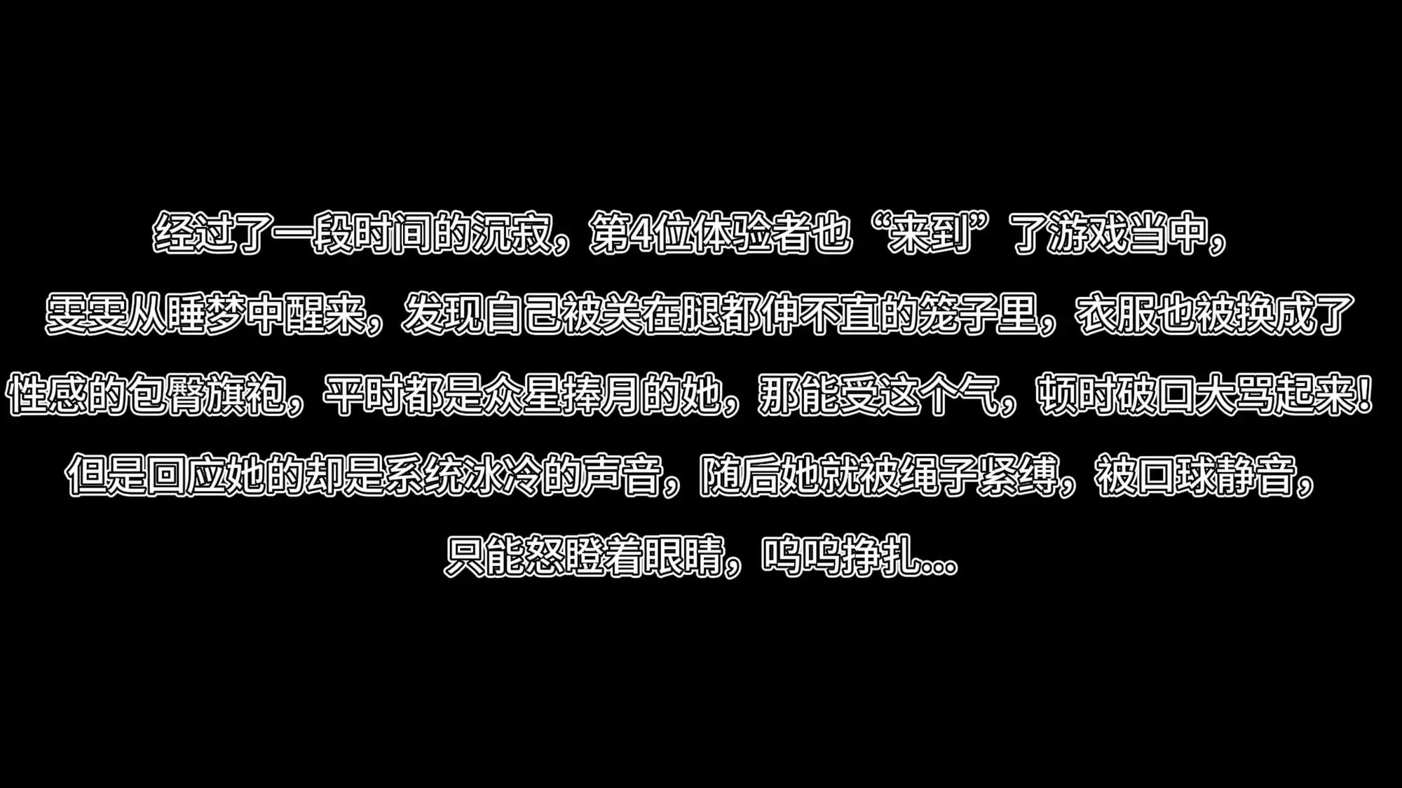 经过了一段时间的沉寂,第4位体验者也“来到”了游戏当中,雯雯从睡梦中醒来,发现自己被关在腿都伸不直的笼子里,衣服也被换成了