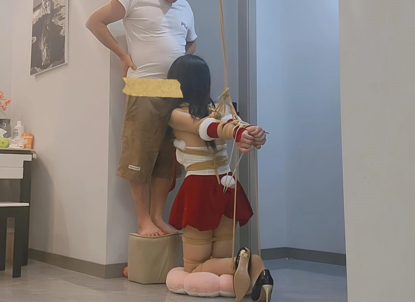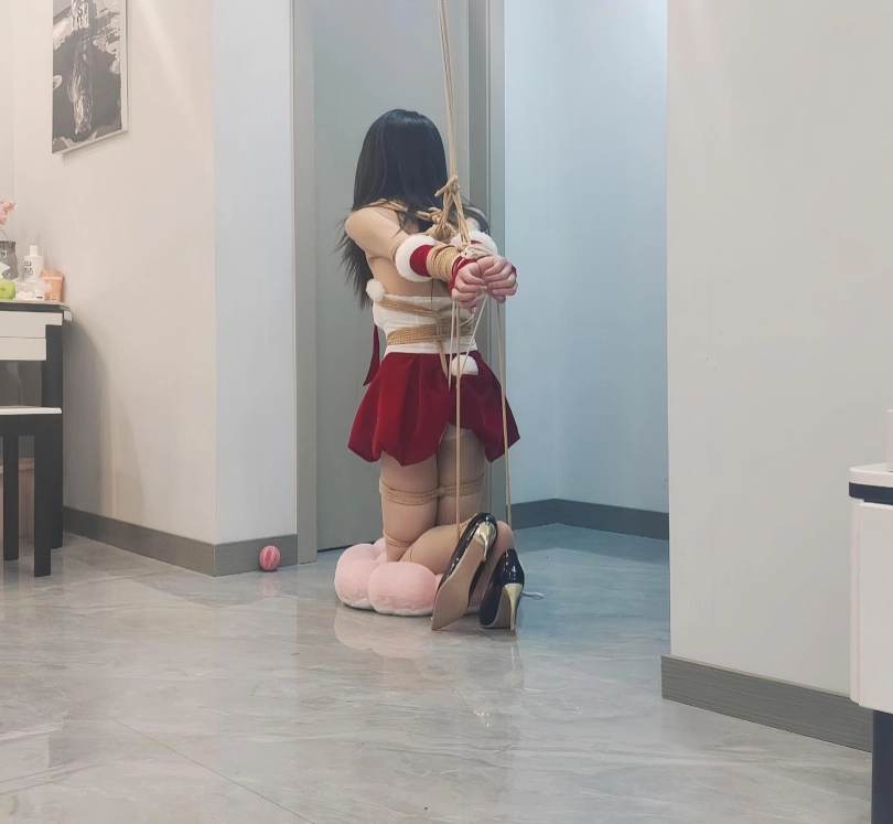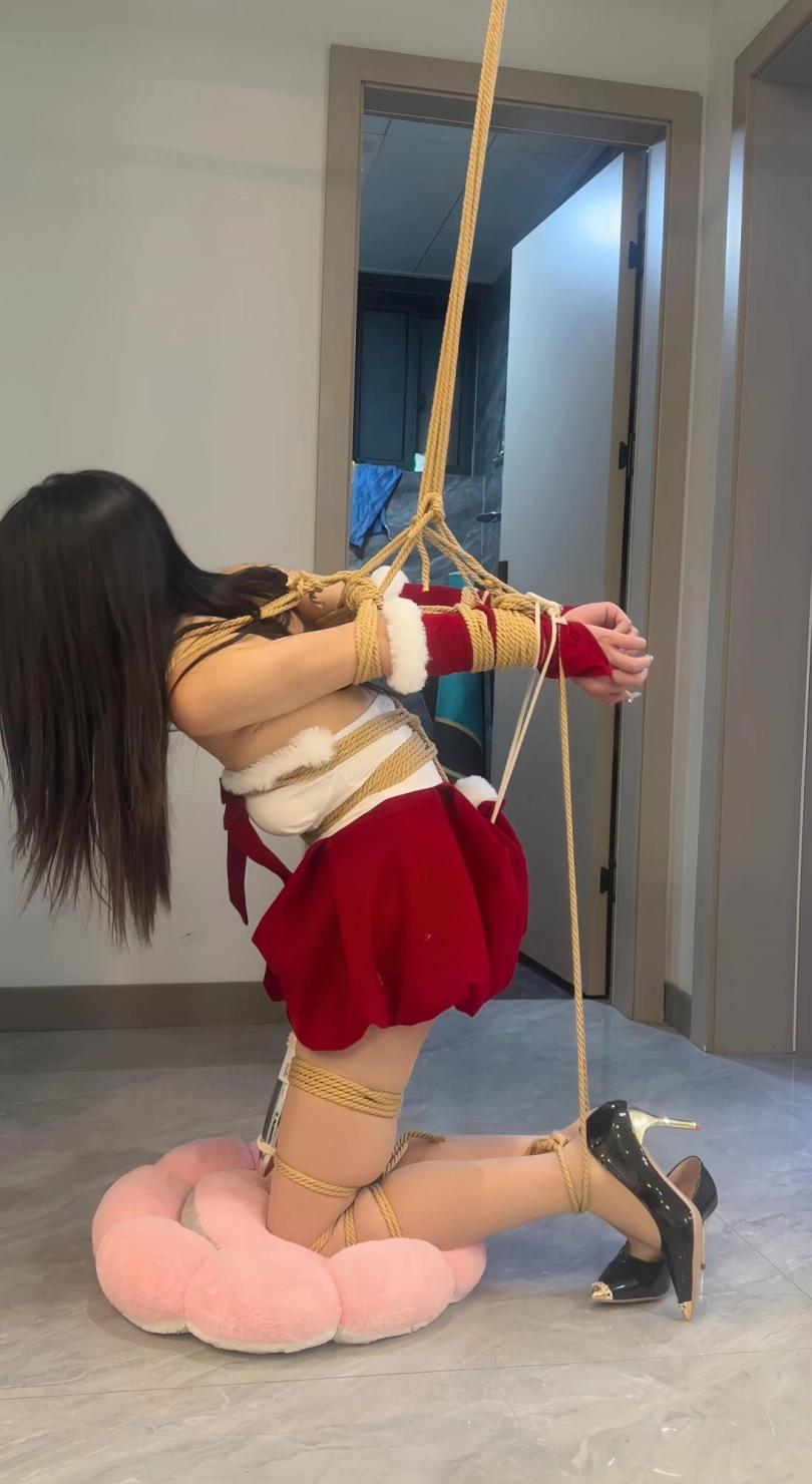 一只被捆绑好的圣诞礼物,跪缚,欧式后手缚,静静的在哪里挣扎,圣诞老人准备开始他的前后左右夹攻