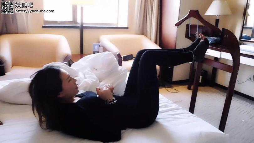 妹子下班回家,躺床上就睡了。这时,偷偷潜伏在屋内的坏人出动,掀开被子,撕开丝袜,锁上脚趾铐,再盖上被子。妹子睡醒,发现身体有点不对劲,掀开被子一看,发现被戴上了脚趾铐,很诧异。妹子下床,各种找钥匙,却找不到,很着急。坏人再次出现,拿来一个架子,解开脚趾铐,把脚趾吊在架子上,然后锁上脚腕、手腕、拇指,离开了。妹子彻底绝望,十分疼痛。