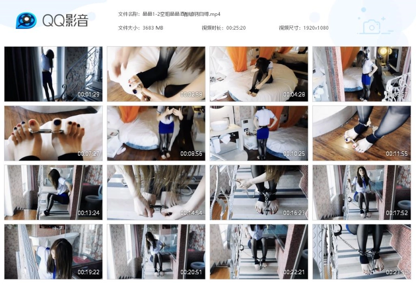 【视频时长】:00:25:20 【文件大小】:3683M 关键词:空姐 晶晶 酒醉 镣铐 自缚 手铐 脚铐 脚趾铐 黑丝 晶晶客串空姐,由于服务不周到被客人数落,心情不好喝闷酒,酒后就开始乱来了哈哈哈!!!稀里糊涂的进了一个房间,还把自己给铐上了,当酒醒过来,真的是一脸懵逼哈哈哈!!!没有钥匙,解不开了哈哈哈!!! 空姐妹子被投诉了,心情烦闷去喝闷酒,酒醉回家,躺在床上,恍惚间见到一个脚趾铐和脚铐,想也没想就脱下高跟鞋,撕开丝袜,给自己锁上了。妹子稍微有点意识后,发现自己的脚不对劲,发现锁上了脚铐和脚趾铐,可却怎么也想不起来是怎么弄上去的了,还是迷迷糊糊的状态。妹子找钥匙,下地行走,找了一下,钥匙没找到。然而妹子找到了一个三通、一个脚镣、一个脚趾铐以及一个说明,上面写着,只要再锁上一个脚趾铐,用脚镣拴住一只脚,三通链接脚腕脚趾,就能得到所有的钥匙。妹子也是太迷糊了,竟然相信了,于是照做。然后,玩耍一会。妹子最后又得到一份说明,把手铐锁在背后,最重钥匙就会出现,妹子仍然照做。做好以后,玩了一会,昏睡了过去。当妹子彻底清醒后,被眼前的一切惊呆了,不记得发生了什么,十分惊恐,不停喊叫哭出来。 ![]() ![]() ![]() ![]() ![]() ![]() ![]() ![]() ![]() ![]() ![]()