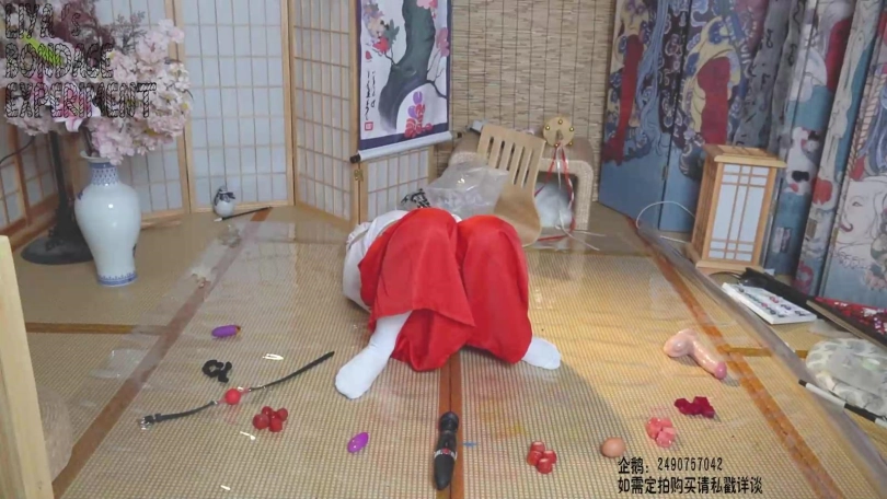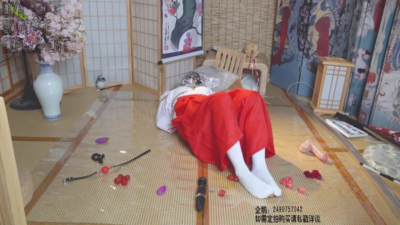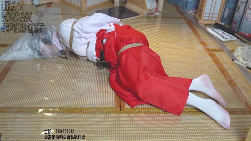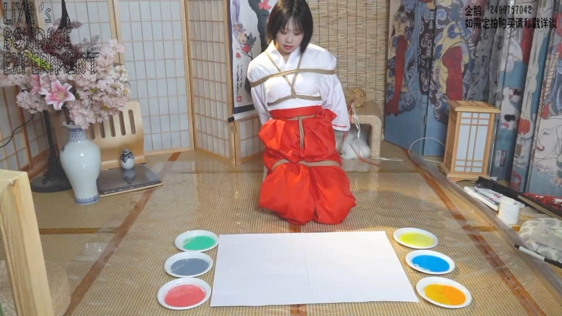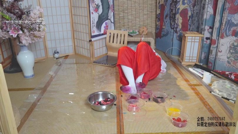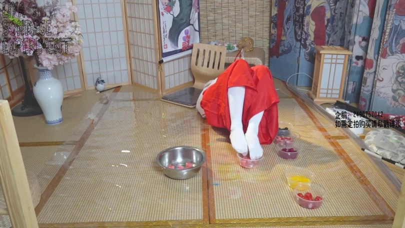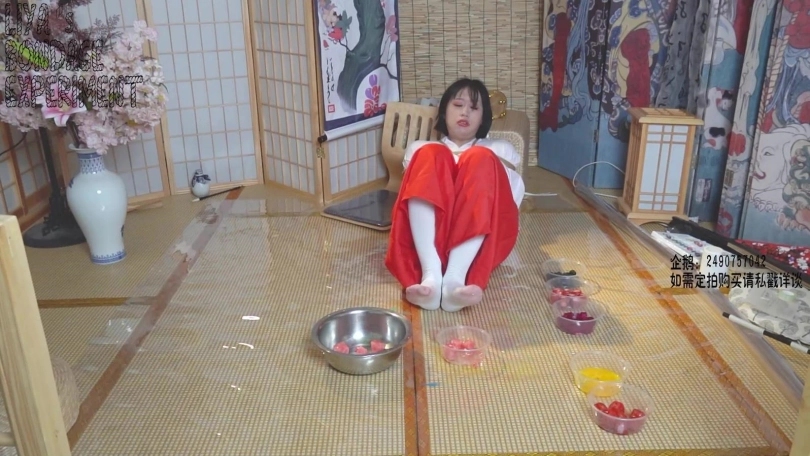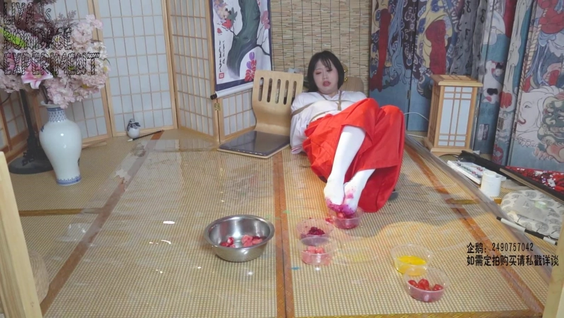 二、巫女小姐姐被绑好后,用脚来将一个个汁水丰富的水果夹入大盆中混合