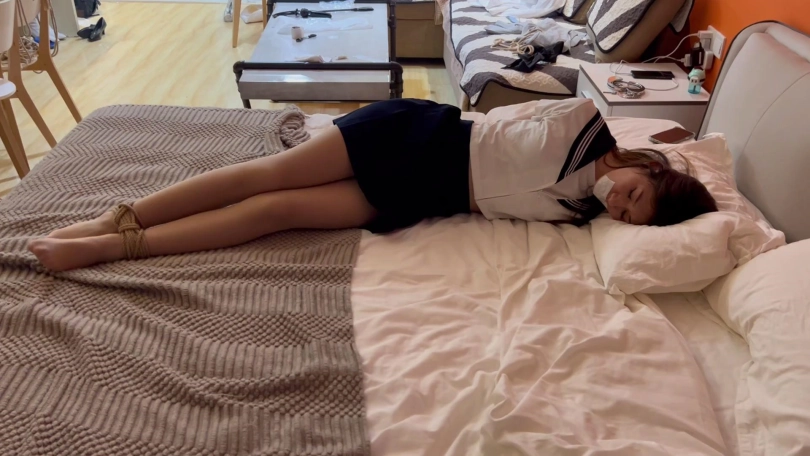 小蓝自己在家里玩镣铐,不知运气是好还是不好,竟然碰到了入室的小偷,于是便被绑起来收拾了。
