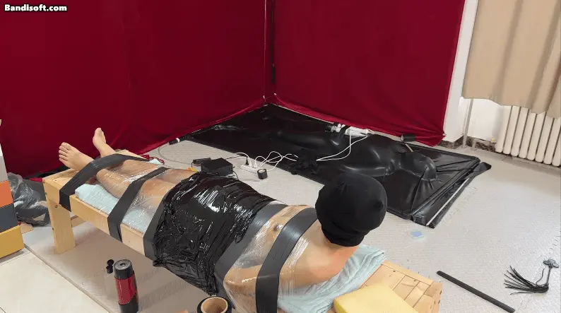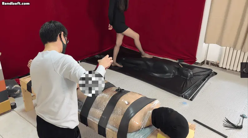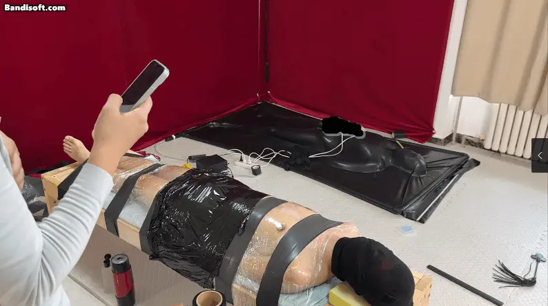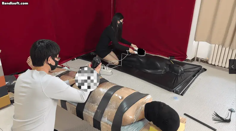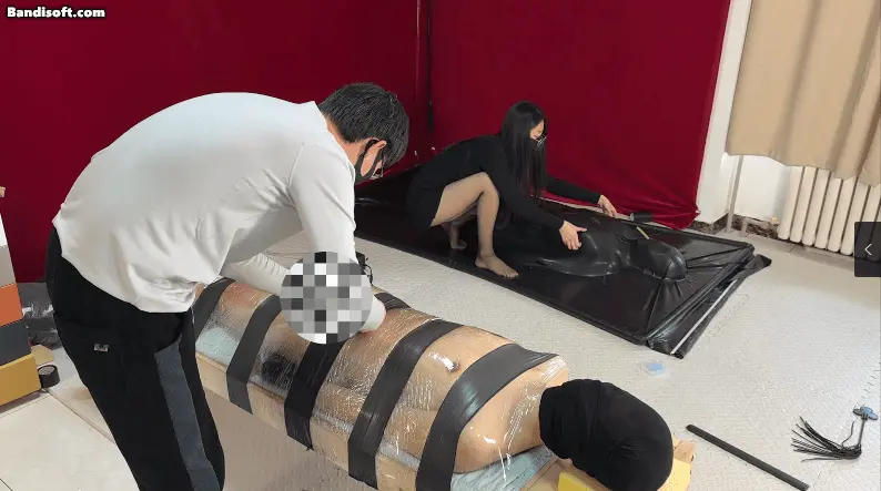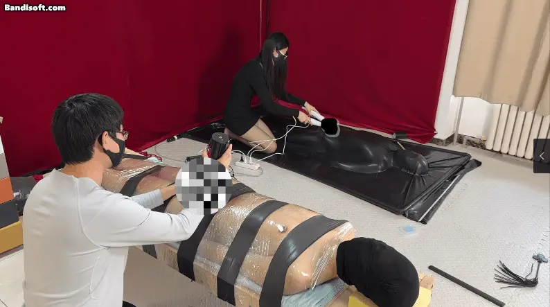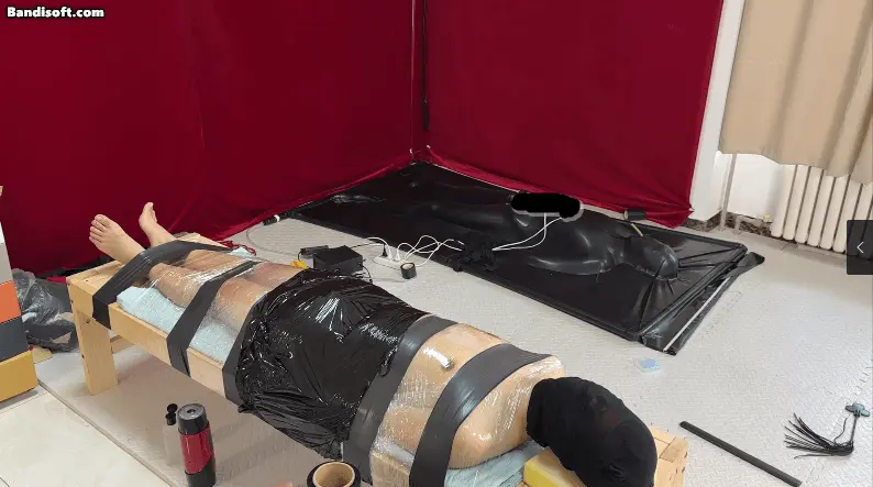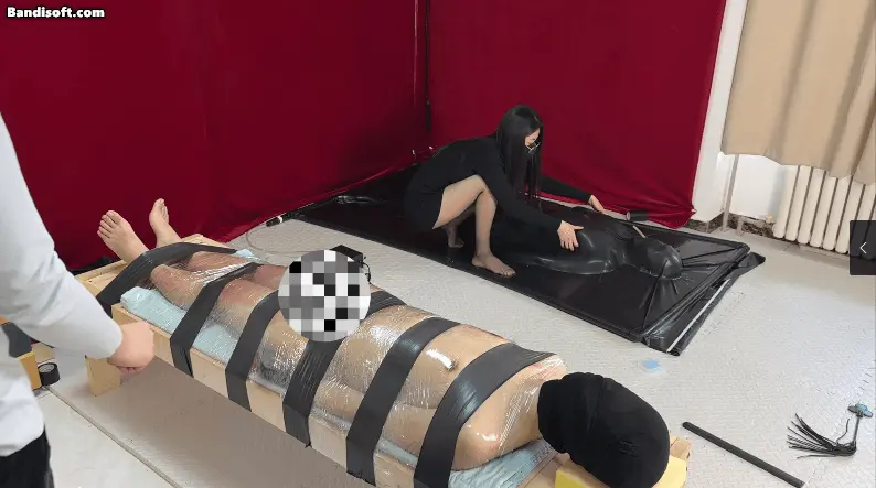 双人同时被榨汁视频,一个被固定在小板床上被缠绕膜全包,下面被榨汁机榨取,另外一个被关在真空床里,被颜老师虐待,榨汁!!
